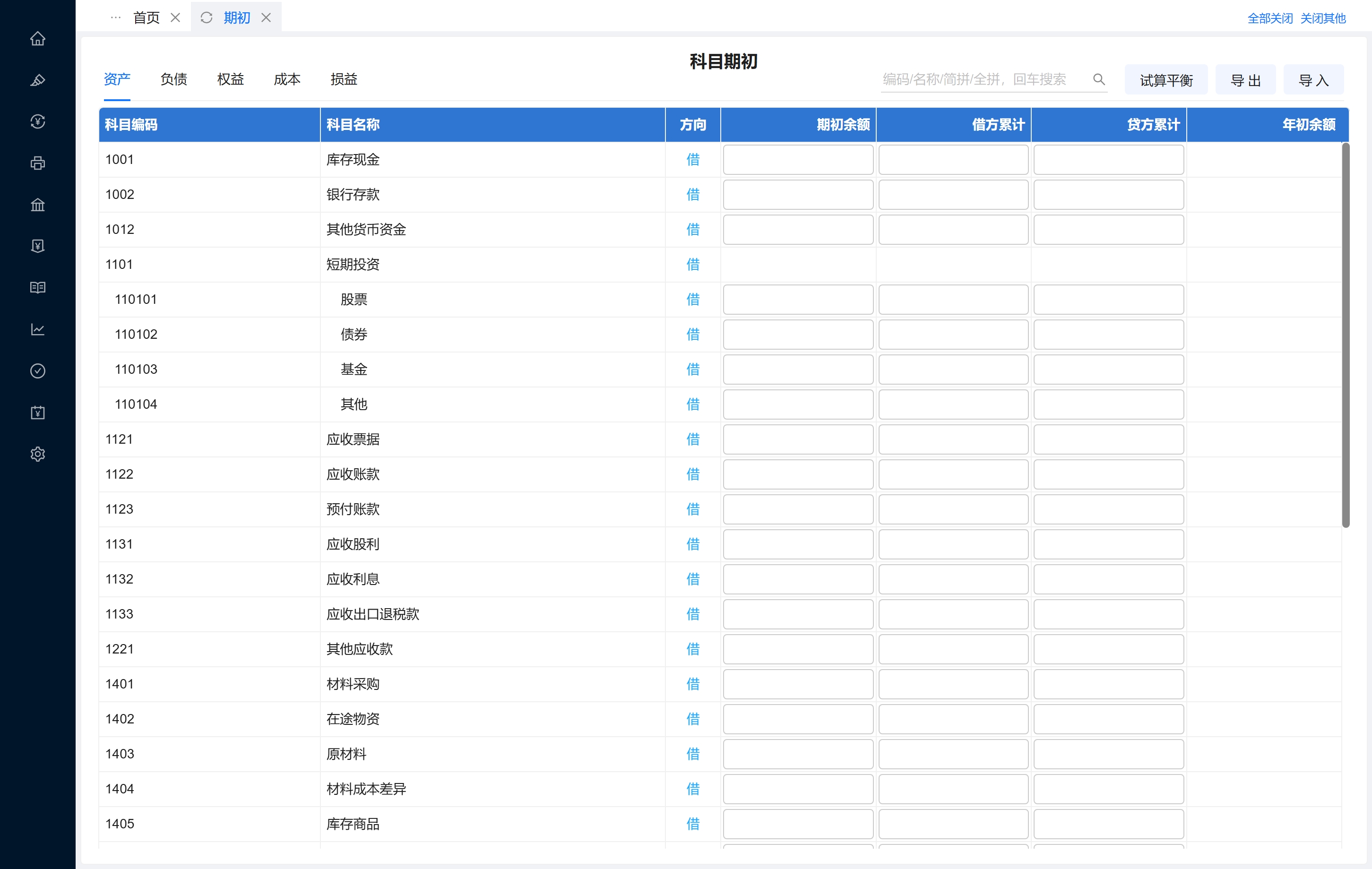 此界面可进行录入科目期初数据、期初数据试算平衡、导入导出期初数据等操作,如下图:
