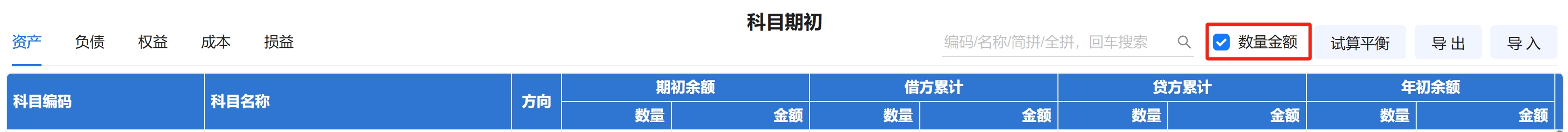 当有一个或多个科目设置了数量核算后,科目期初页面会自动显示数量金额复选框,且表格会自动显示数量列,如下图所示: