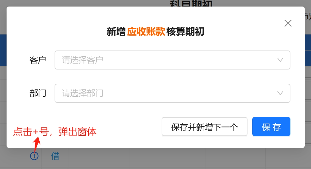 当科目设置了辅助核算后,相应的科目名称后面会自动出现+号按钮,点击此按钮弹出新增某某核算期初对话框,如下图所示: