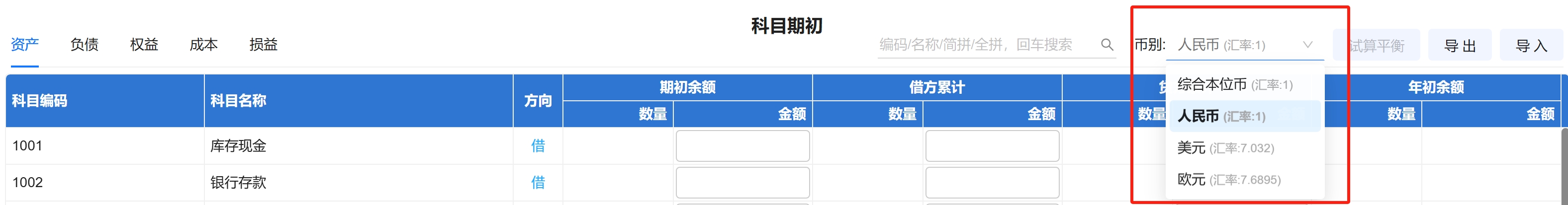 (1) 点击币别下拉列表框,如果选择了人民币或外币,期初表格数据只会显示拥有人民币或外币核算的科目。