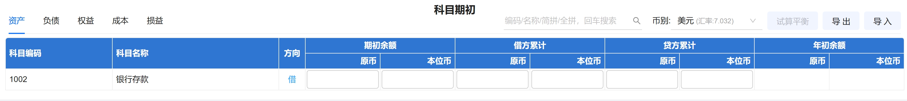 (4) 如果当前选择的是外币,需要输入原币期初,本位币期初会根据汇率自动计算,例如选择美元,如下图