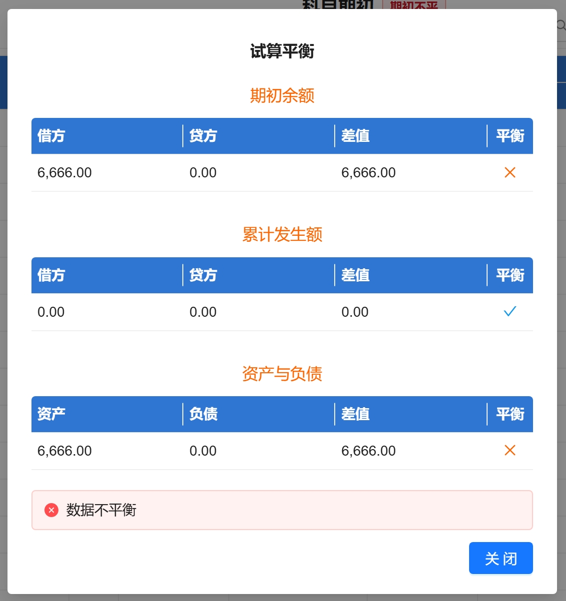 (3) 期初不平也会导致资产负债表不平,所以录入科目期初一定要确保数据平衡
