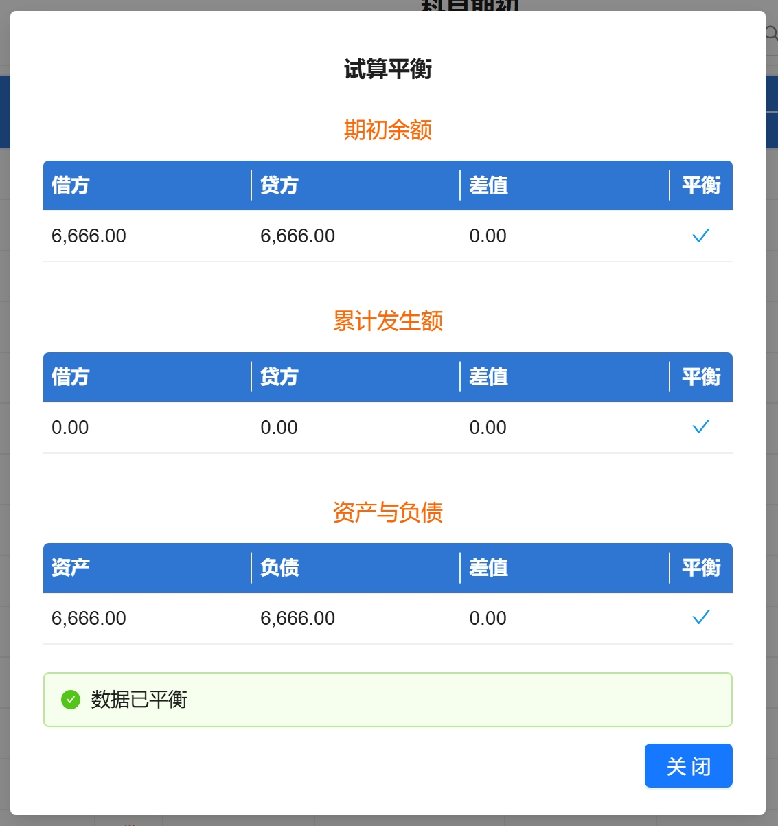 科目期初数据录入完毕,可点击试算平衡按钮,测试期初数据是否平衡,如下图所示:
