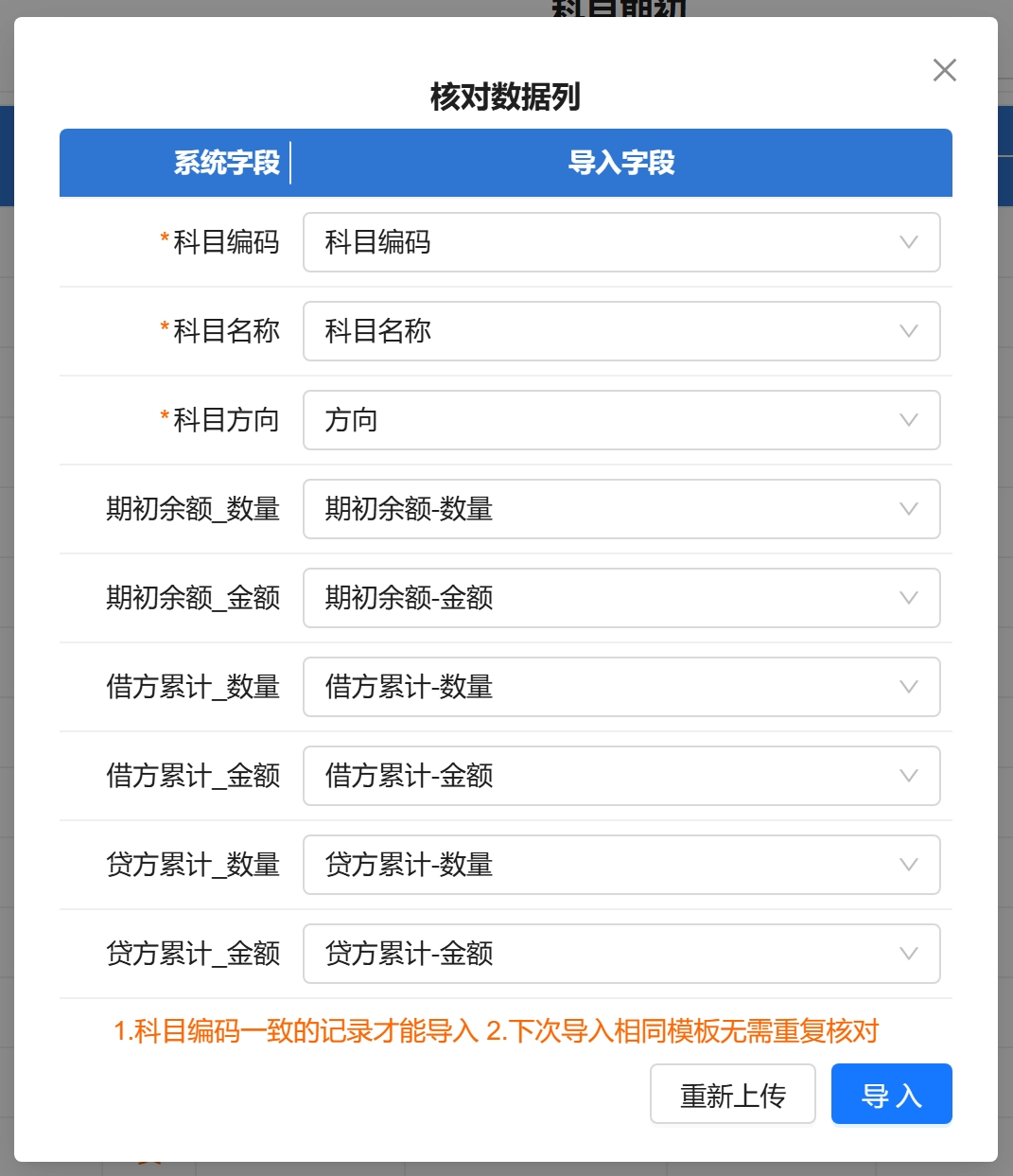 核对系统字段和导入文件的字段是否匹配正确,核对无误后点击导入科目期初