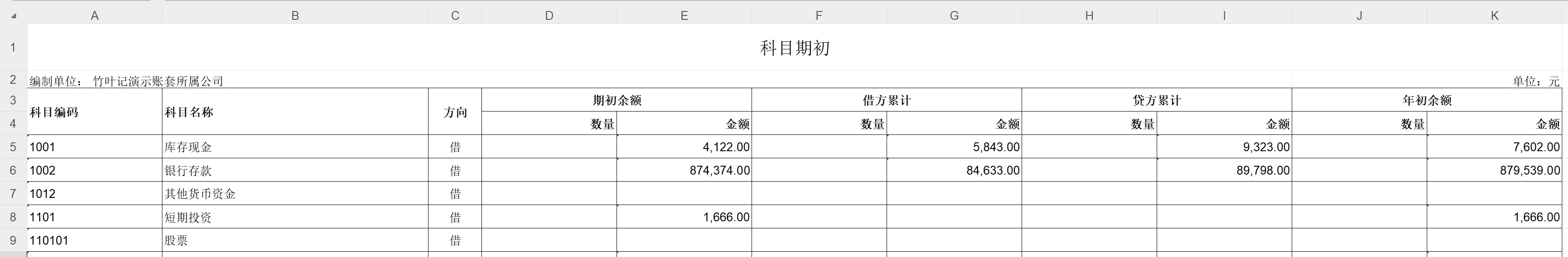本功能可导出科目期初,以方便导入其他平台或本平台,点击导出按钮,即可导出科目期初,导出的格式如下图: