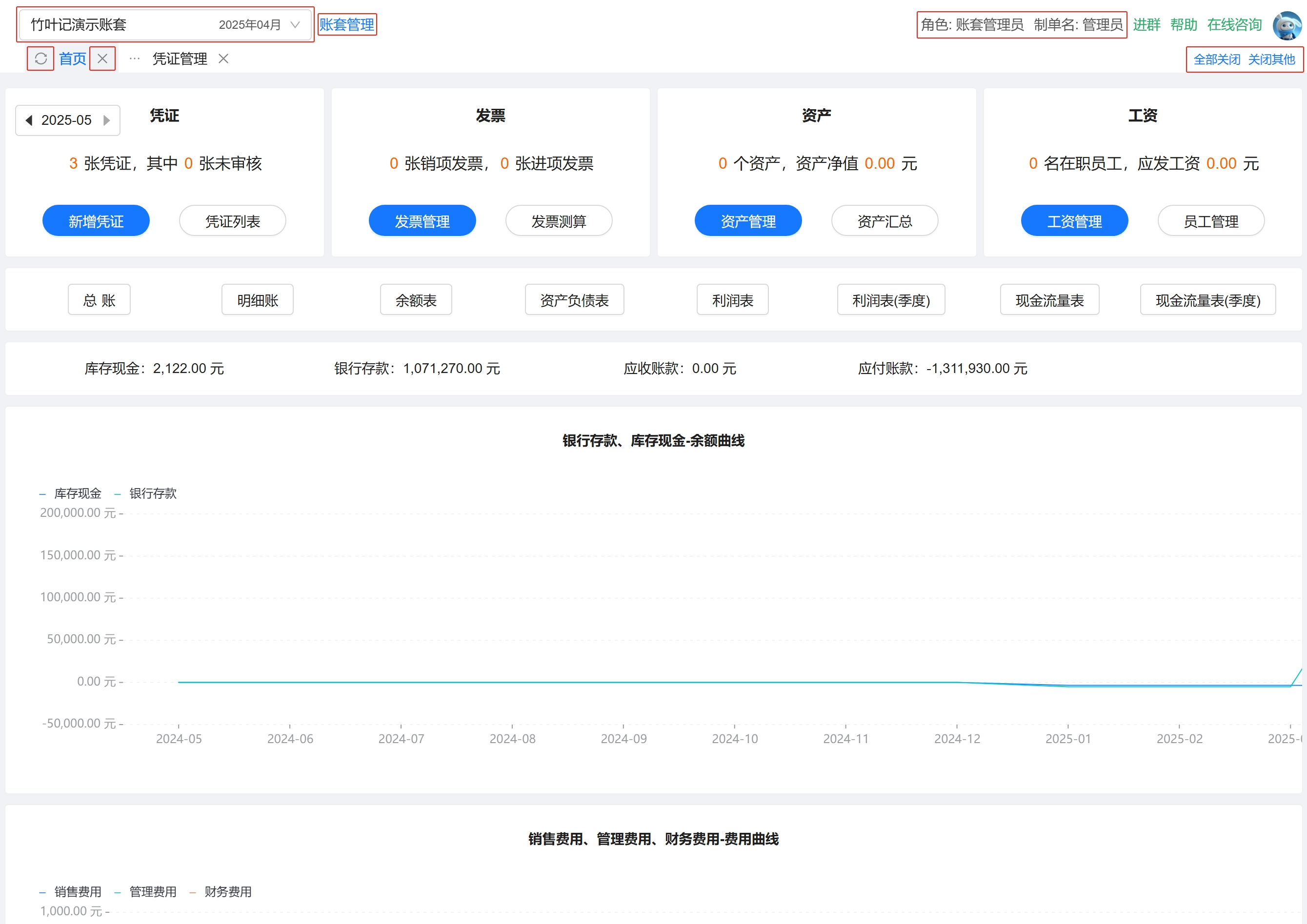 (1) 顶部显示的账套名称,就是新建账套时录入的账套名称;点击账套名称,显示下拉菜单,可更换当前操作的账套