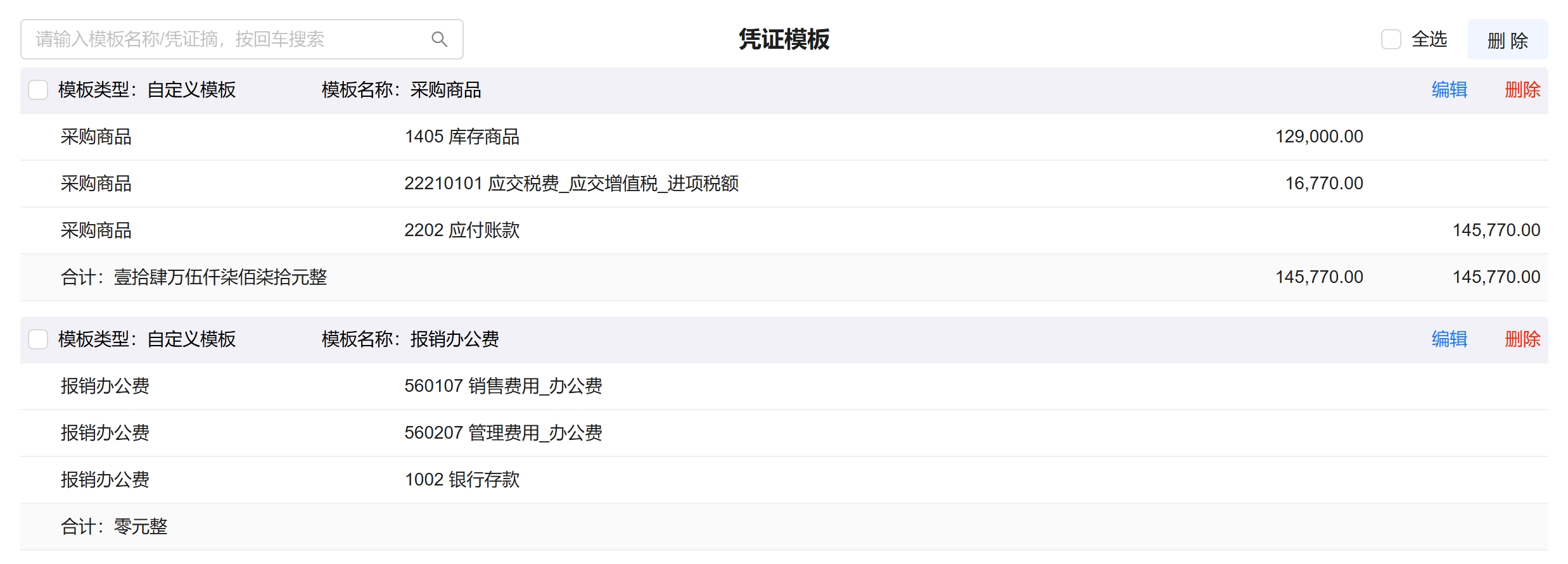 在搜索框输入模板名称或凭证摘要按Enter键搜索,支持全拼和简拼,例如搜索【采购商品】,可输入采购商品或cgsp进项搜索