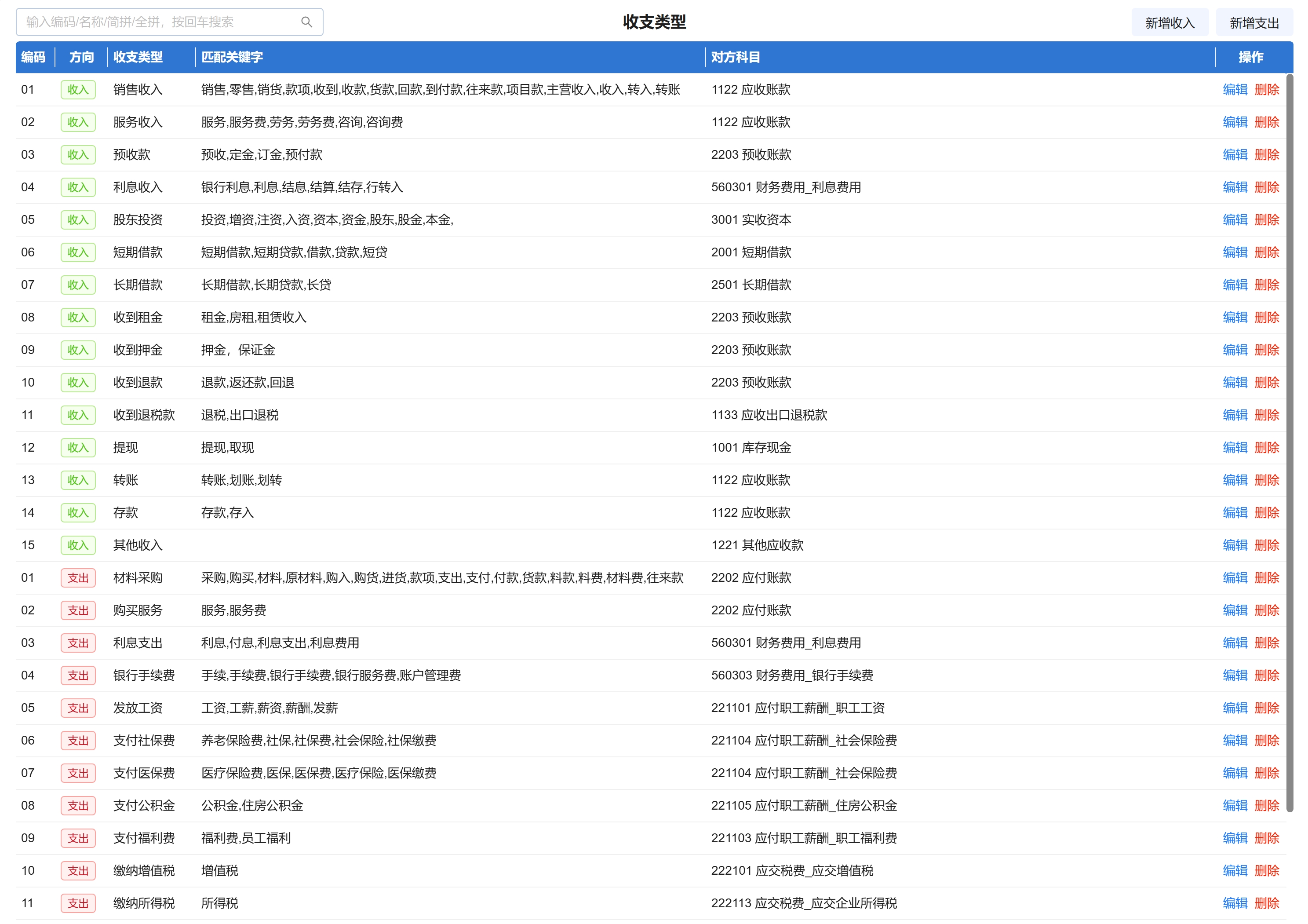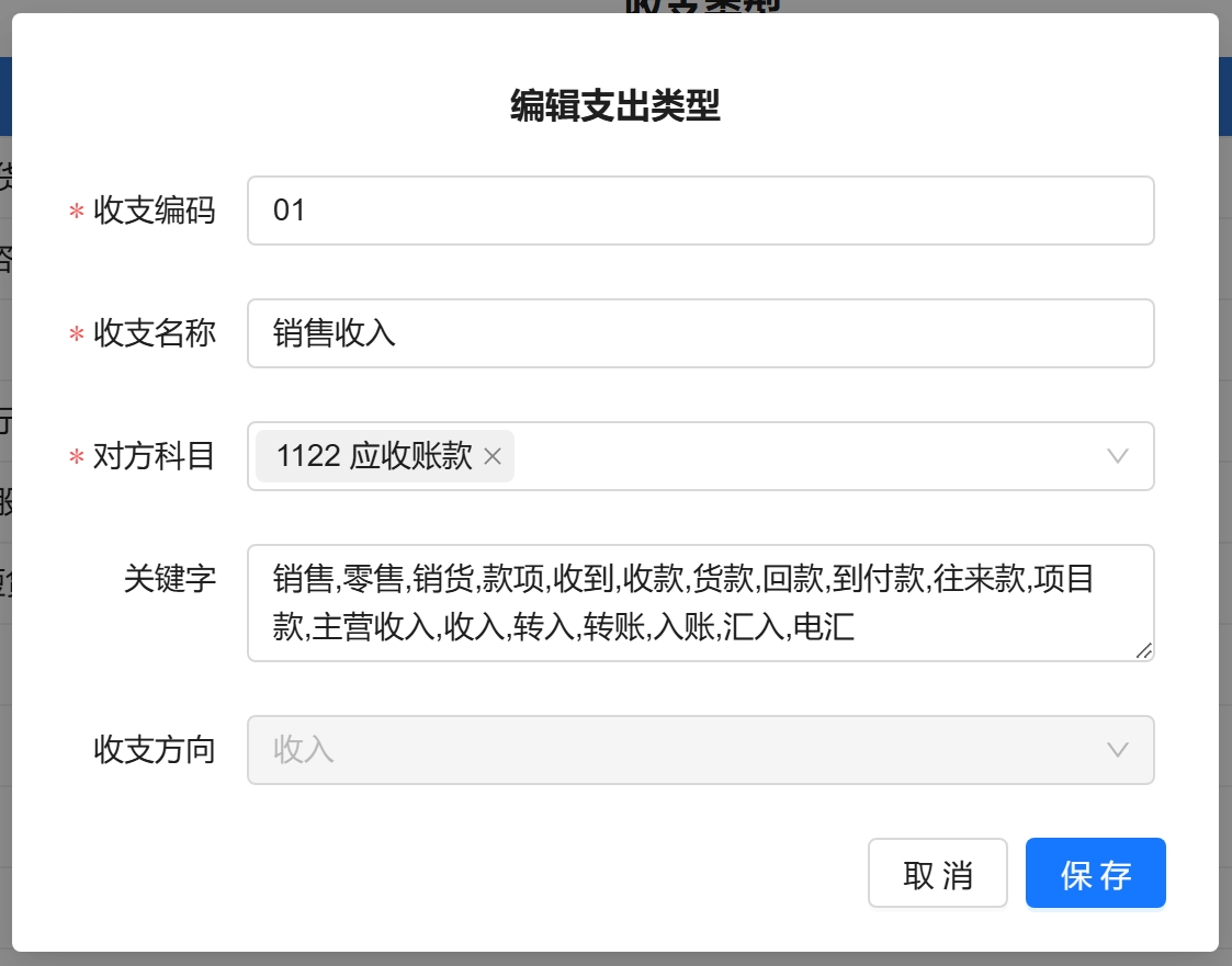 关键字 :用于通过日记账摘要自动匹配收支类型,例如摘要是"销售商品",而销售收入类型的关键字有"销售"关键字,即可匹配上
