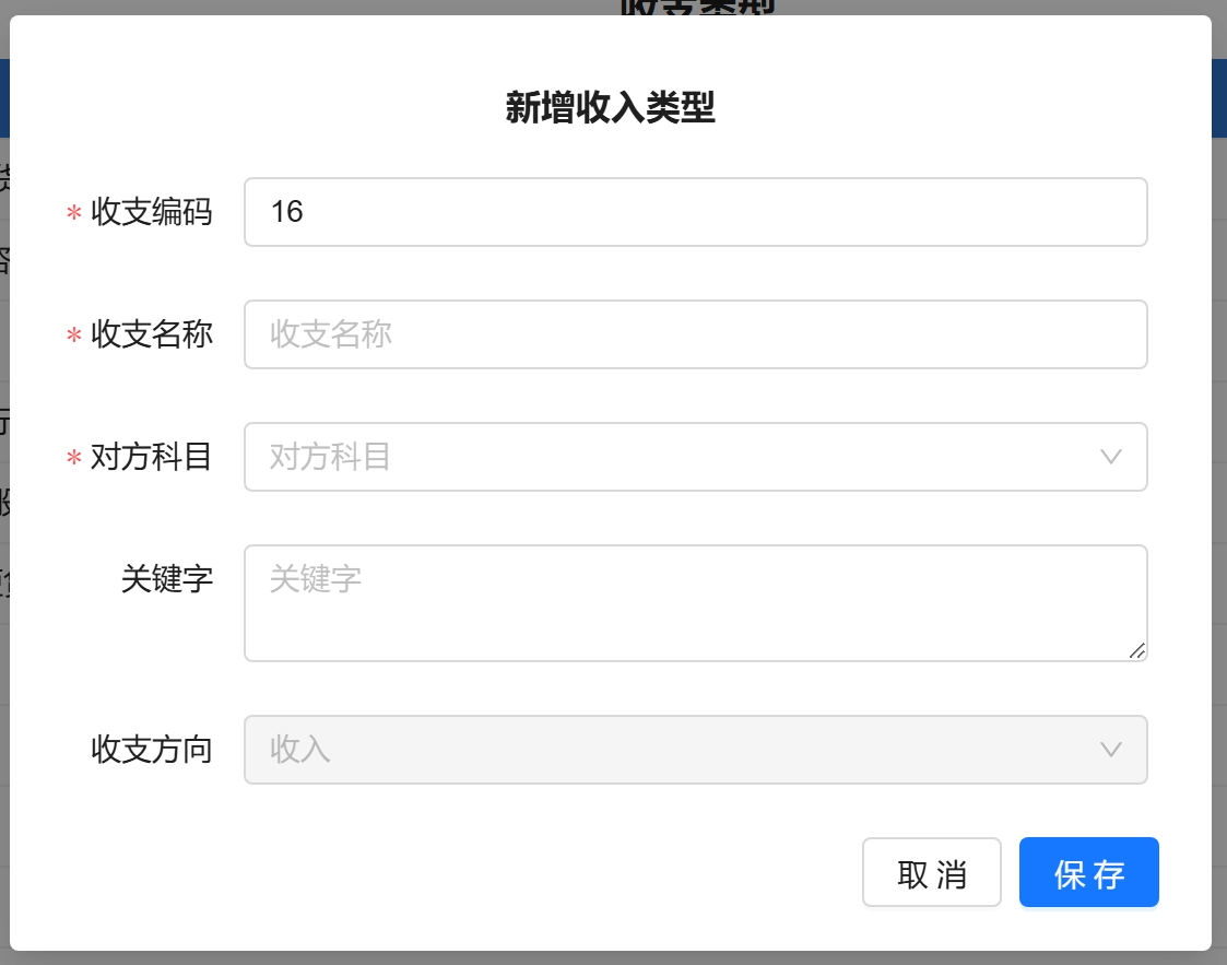 点击收支类型的编辑按钮,弹出编辑对话框,可编辑收支类型,如下图所示: