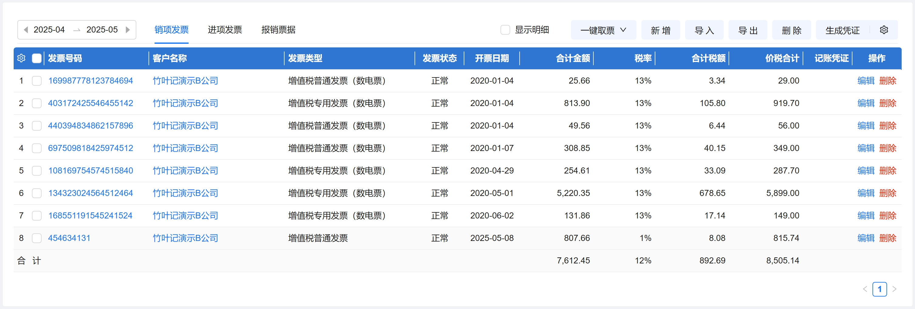 此页面用于管理销项发票,主要功能有检索发票、一键取票、手动新增发票、导入导出发票、删除发票、一键生成凭证等,如下图: