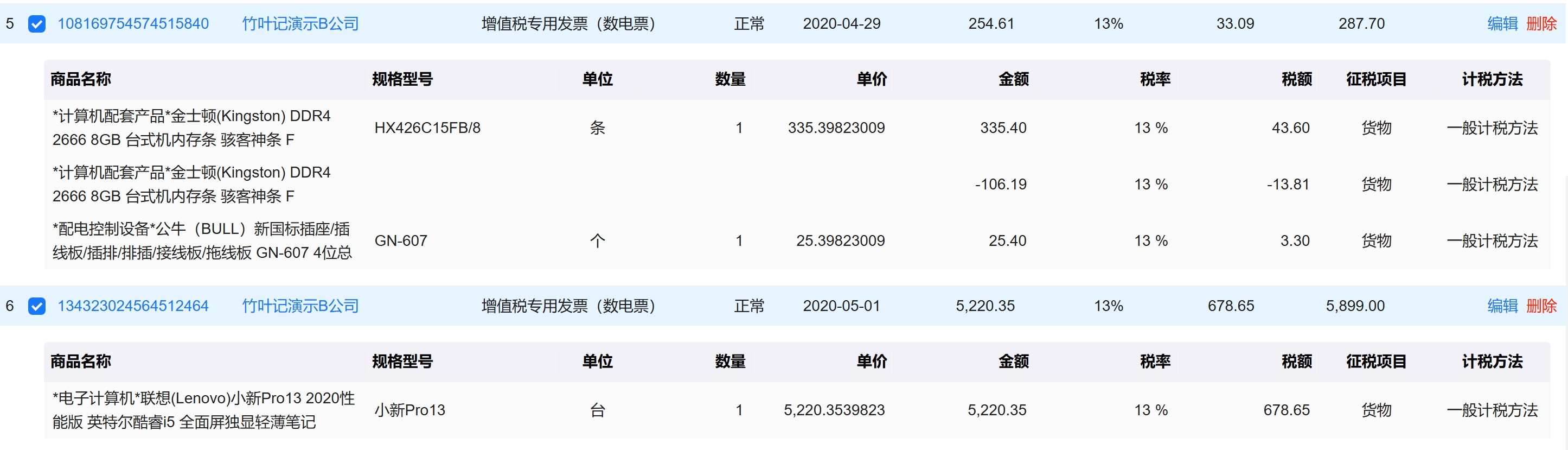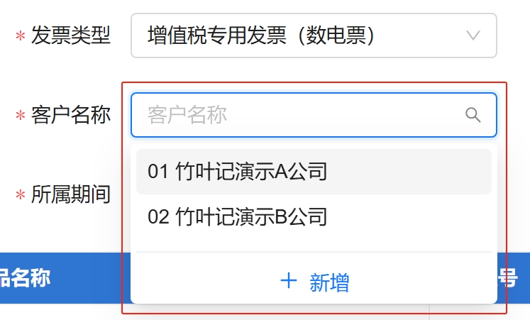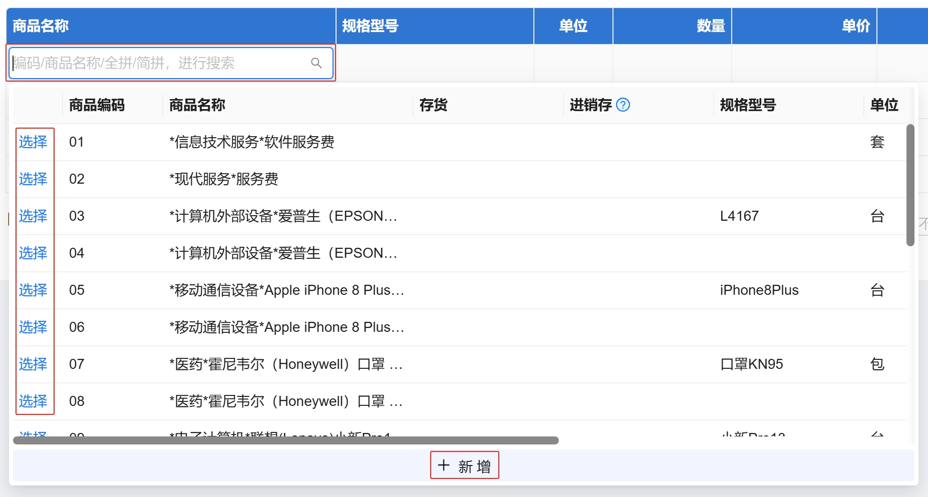 (3) 发票明细中的商品也是从下拉列表框中选择的,数据来自历史商品,选择后,商品名称、规格信号、单位、单价、税率等信息会自动填充到发票明细中