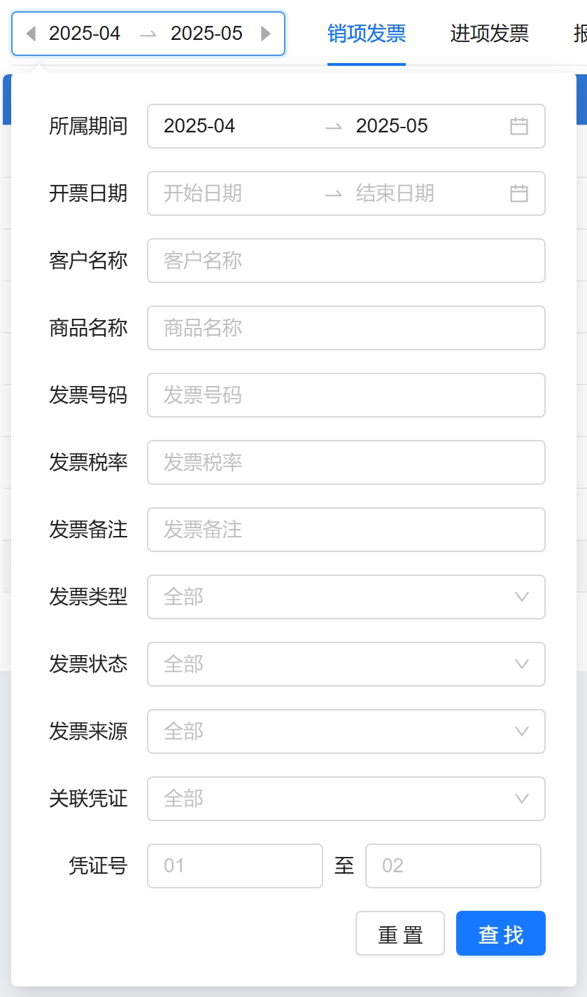 点击左上角的日期控件,弹出检索发票窗口,可根据条件检索发票;也可在不打开检索窗口的情况下,点击向左、向右箭头快速切换会计期间