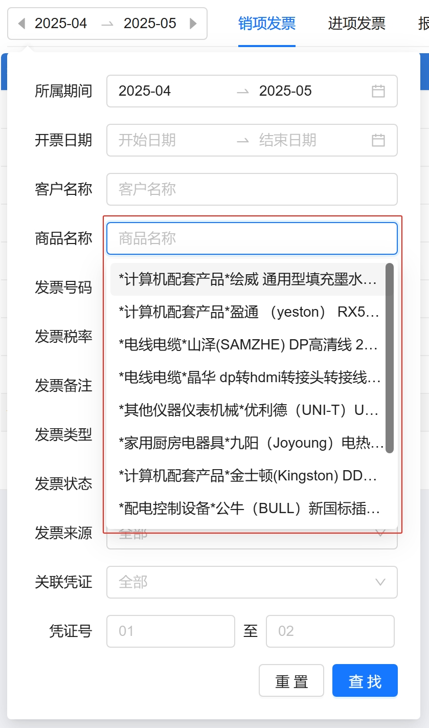 除了最后的凭证号字段其他所有字段都是下拉选择框,无需手动输入内容,直接选择即可筛选,例如检索"商品名称",如下图所示: