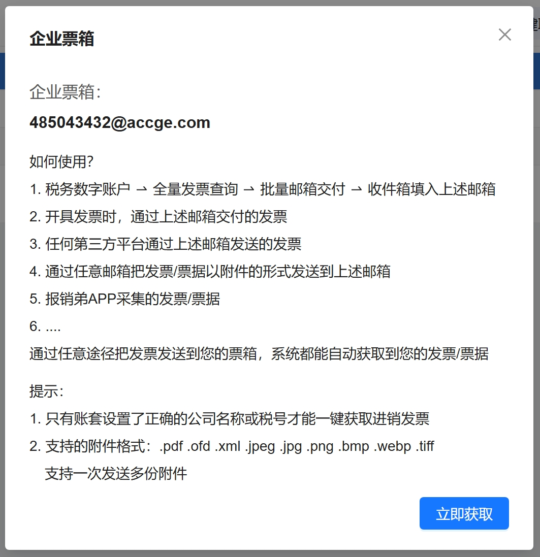 (2) 点击立即获取后,发票箱中的发票会根据账套所属公司是发票开具方还是接收方进入进项发票还是销项发票列表