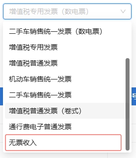 (1) 如果是没有开具发票取得的收入,可从发票类型下拉列表中选择无票收入,如下图: