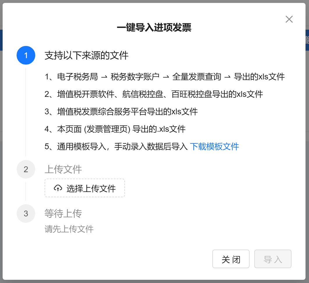 点击导入按钮,弹出一键导入发票对话框,如下图: