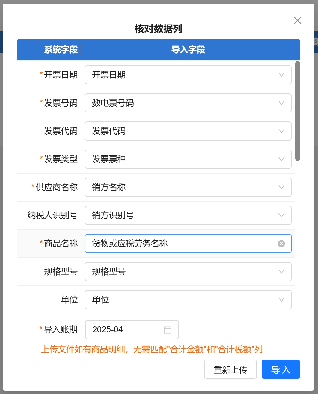 核对系统字段和导入文件的字段是否匹配正确,核对无误后点击导入发票