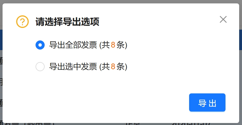 本功能可导出所选发票,以方便导入其他平台或本平台,点击导出按钮,弹出导出发票对话框,点击导出即可导出发票,如下图:
