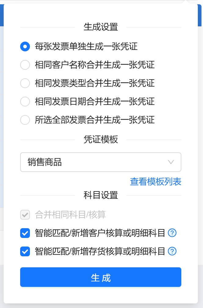 (1) 生成设置:可设置每账发票生成一张凭证,也可设置多张发票汇总生成一张凭证