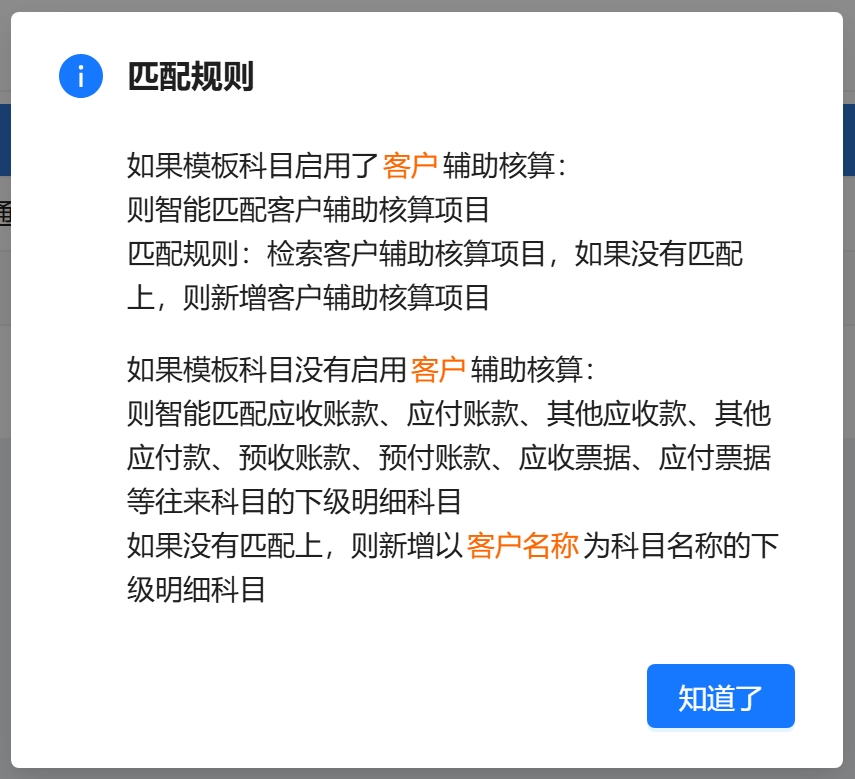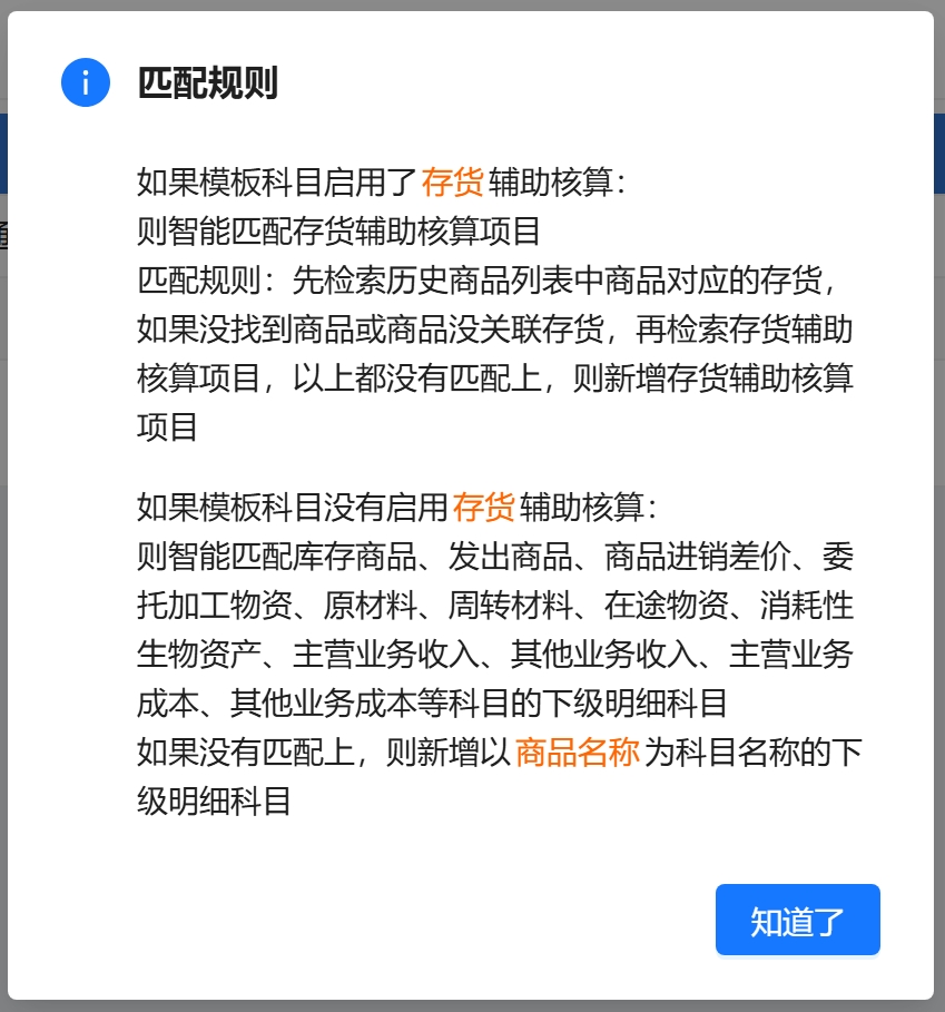 (4) 科目匹配:勾选智能匹配,1.可以匹配或新增客户核算或明细科目,2.可以匹配或新增存货核算或明细科目,具体可点击?号查看,如下图: