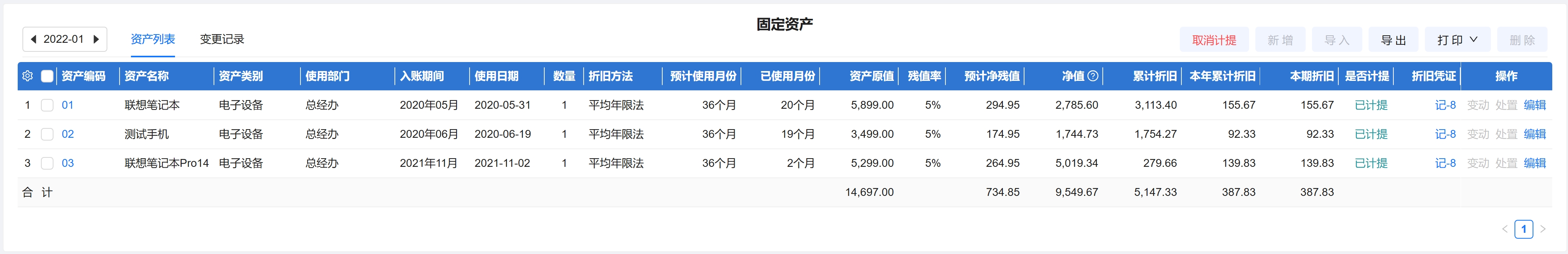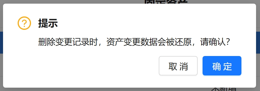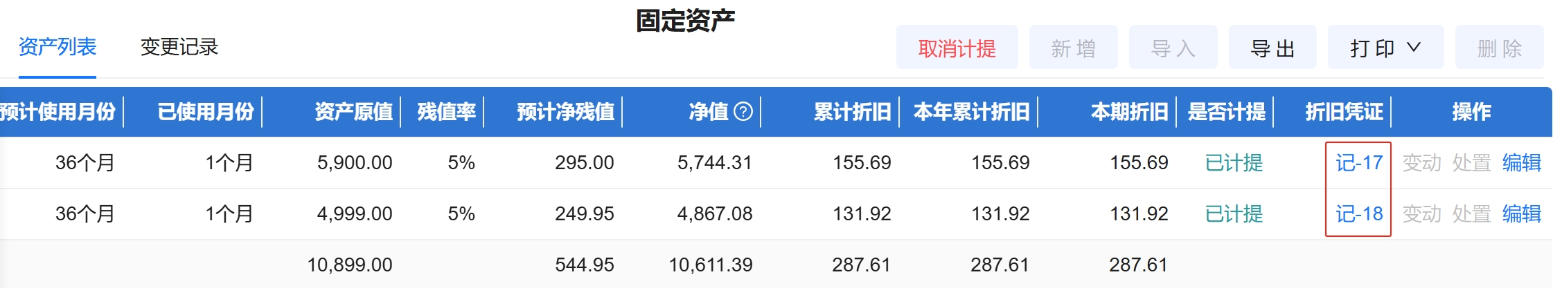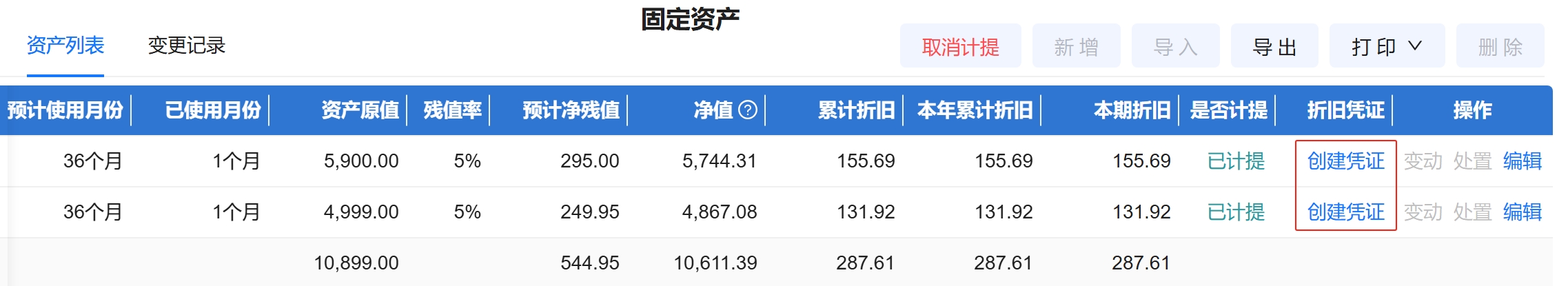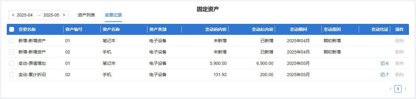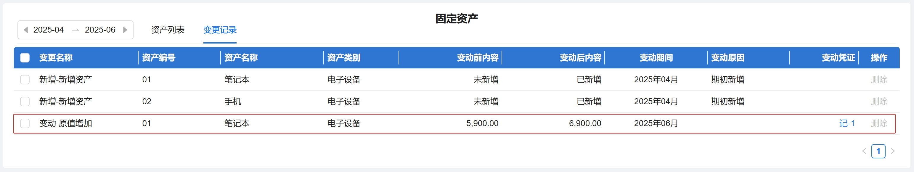 (4) 如想取消变动,直接删除变动记录即可,删除后所有变动数据都会还原;在删除前请先删除关联的记账凭证,如果当期已计提折旧也请先取消折旧再删除