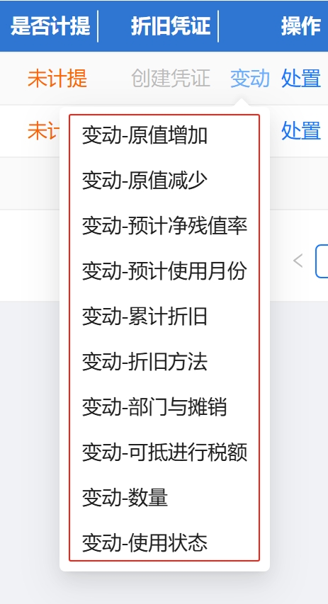 如果资产在使用的过程中数据发生了变化,可进行资产变动处理, 点击资产操作列的变动按钮,弹出变动类型下拉列表,根据资产具体情况选择变动类型
