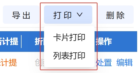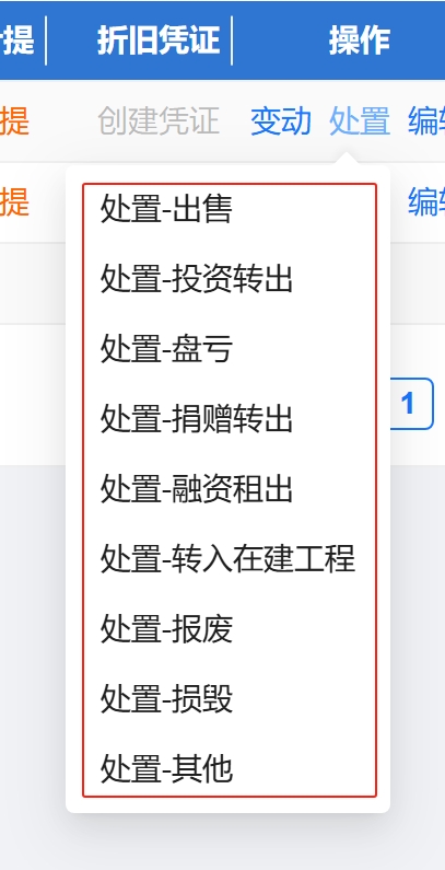 如果资产已折旧完毕或已转出或已损坏等,可进行资产处置处理, 点击资产操作列的处置按钮,弹出处理类型下拉列表,根据资产具体情况选择处置类型
