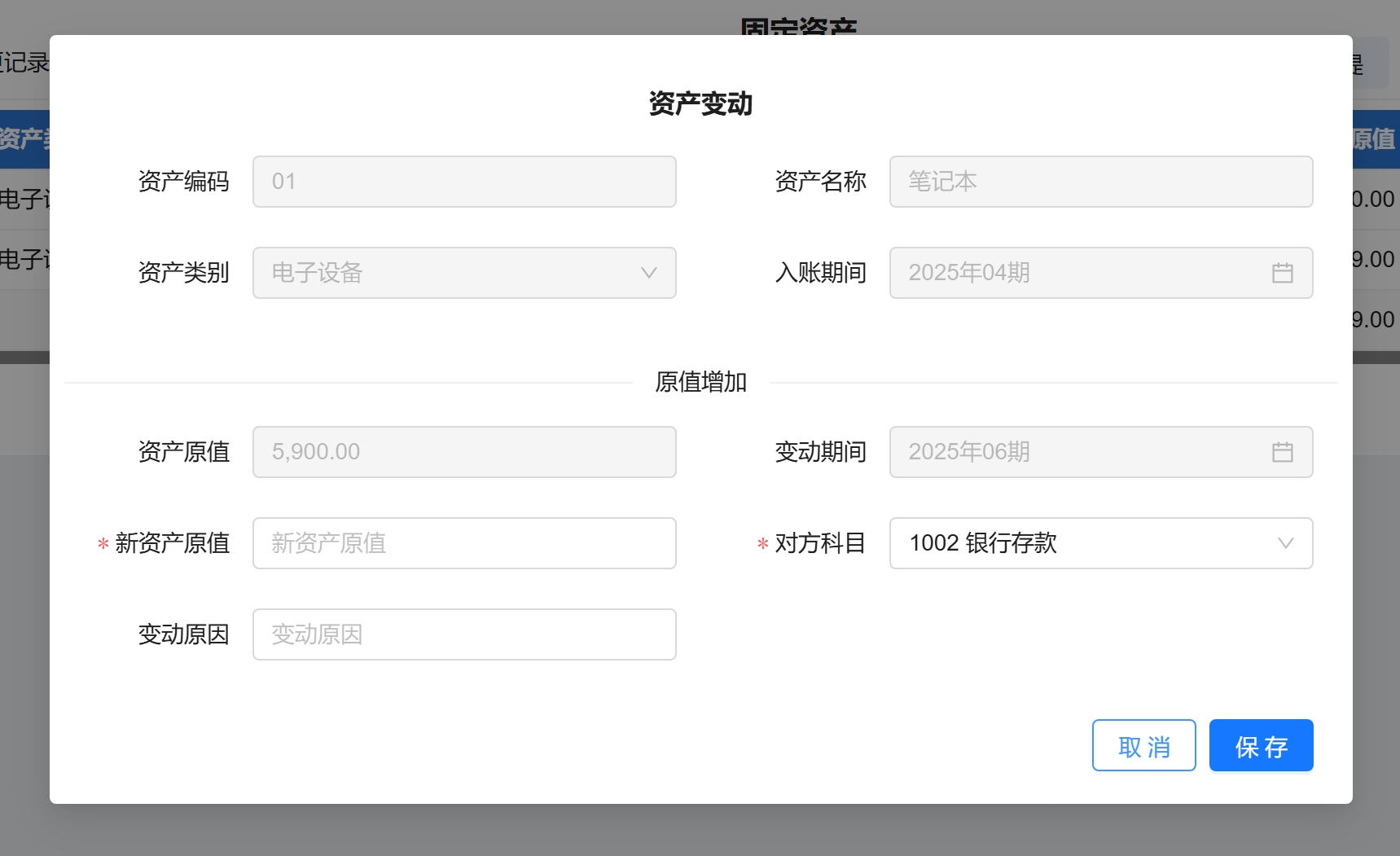 (1) 下拉选择变动类型或处置类型,弹出新增变动类型对话框,每种变动类型和处置类型弹出的对话框都不一样,现已"资产变动-原值增加"为例说明,如下图:
