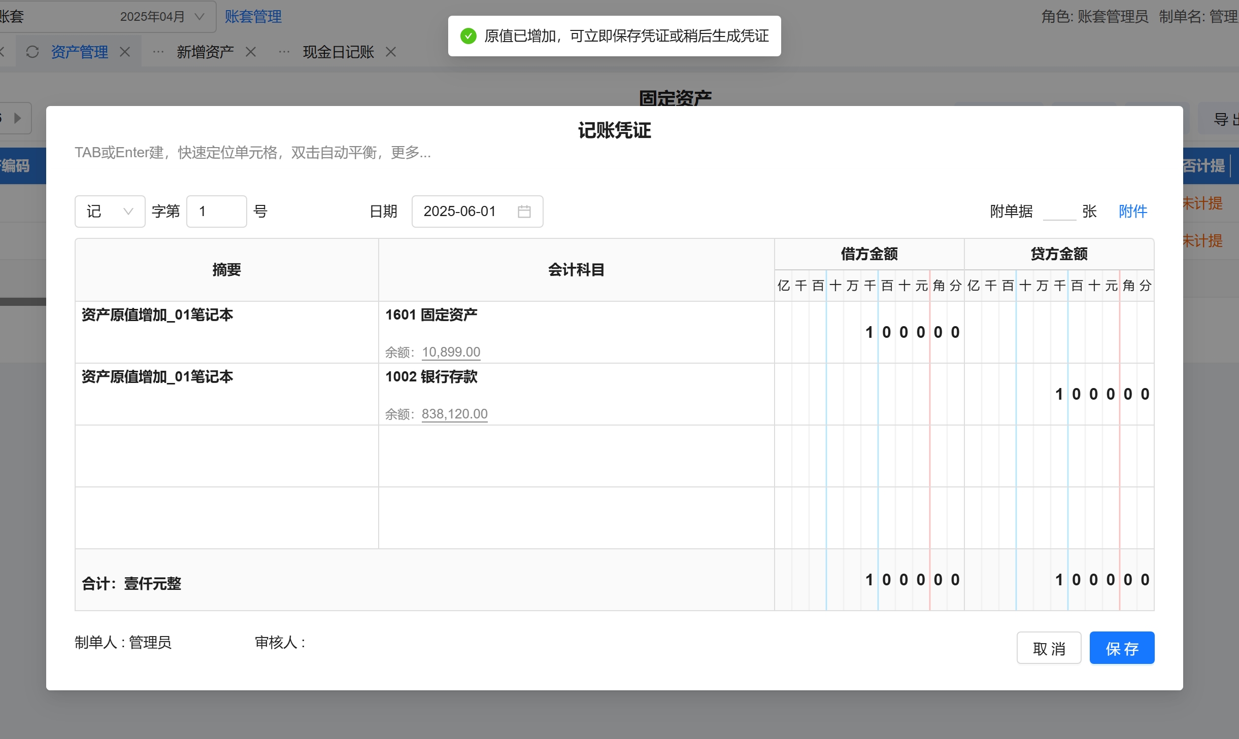 (2) 输入新资产原值、对方科目等信息,点击保存,弹出记账凭证对话框,其中摘要、科目、金额都已根据资产数据自动计算,如下图: