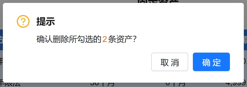 (1) 点击删除按钮,弹出删除对话框,点击确定即可批量删除资产,如下图所示: