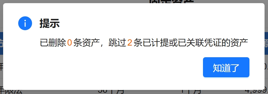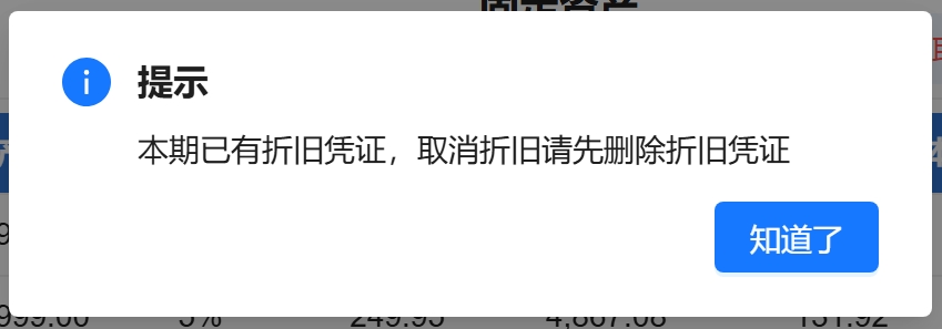 (2) 删除资产时,如果资产已折旧或已关联折旧凭证,需先取消折旧或删除关联的折旧凭证,如下图: