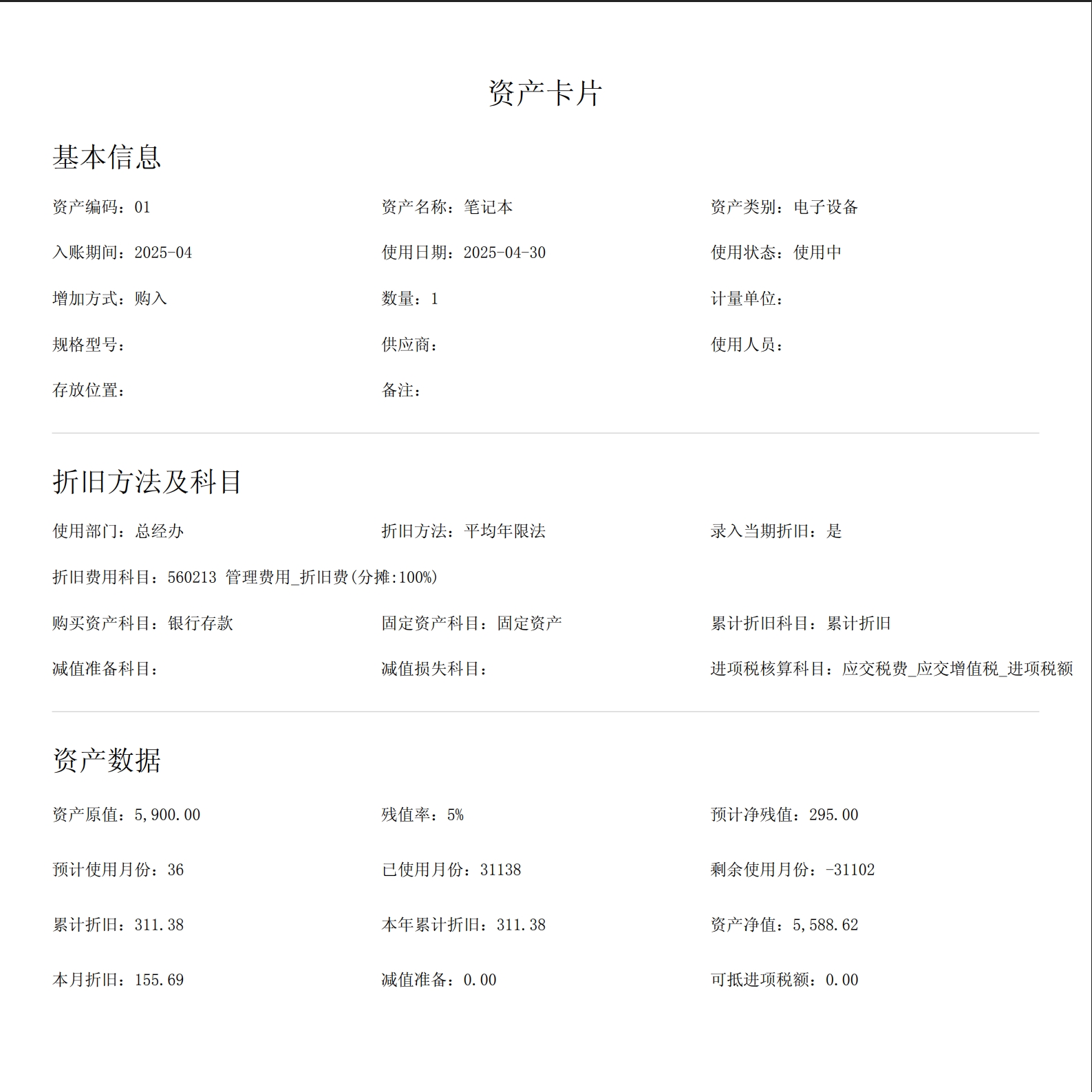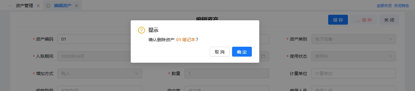 点击资产的编辑按钮即可编辑资产,如果资产还没有折旧记录则可以编辑所有字段,否则只能编辑部分字段;编辑功能与新增功能类似,不再赘述