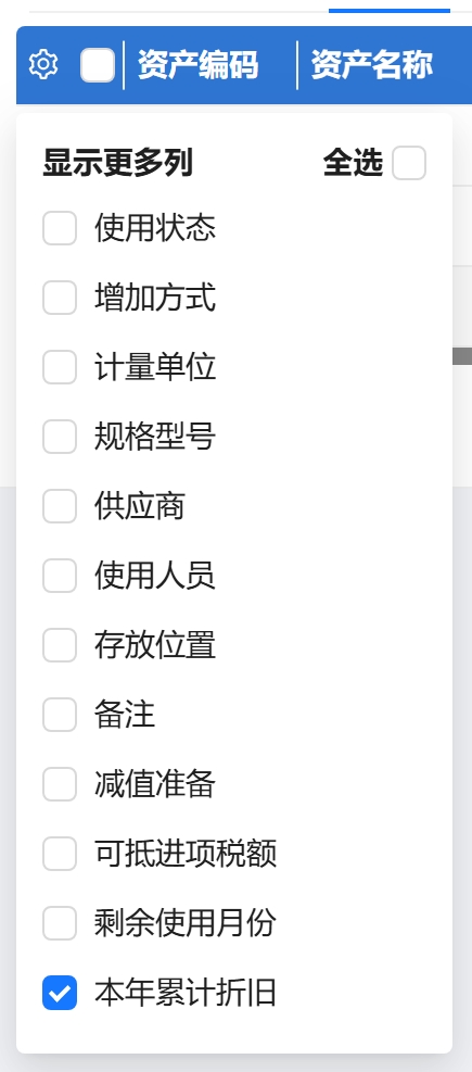 (3) 默认情况下,表格并未完全显示所有列,点击左上角齿轮,打开列设置,可勾选要显示的列,如下图所示::