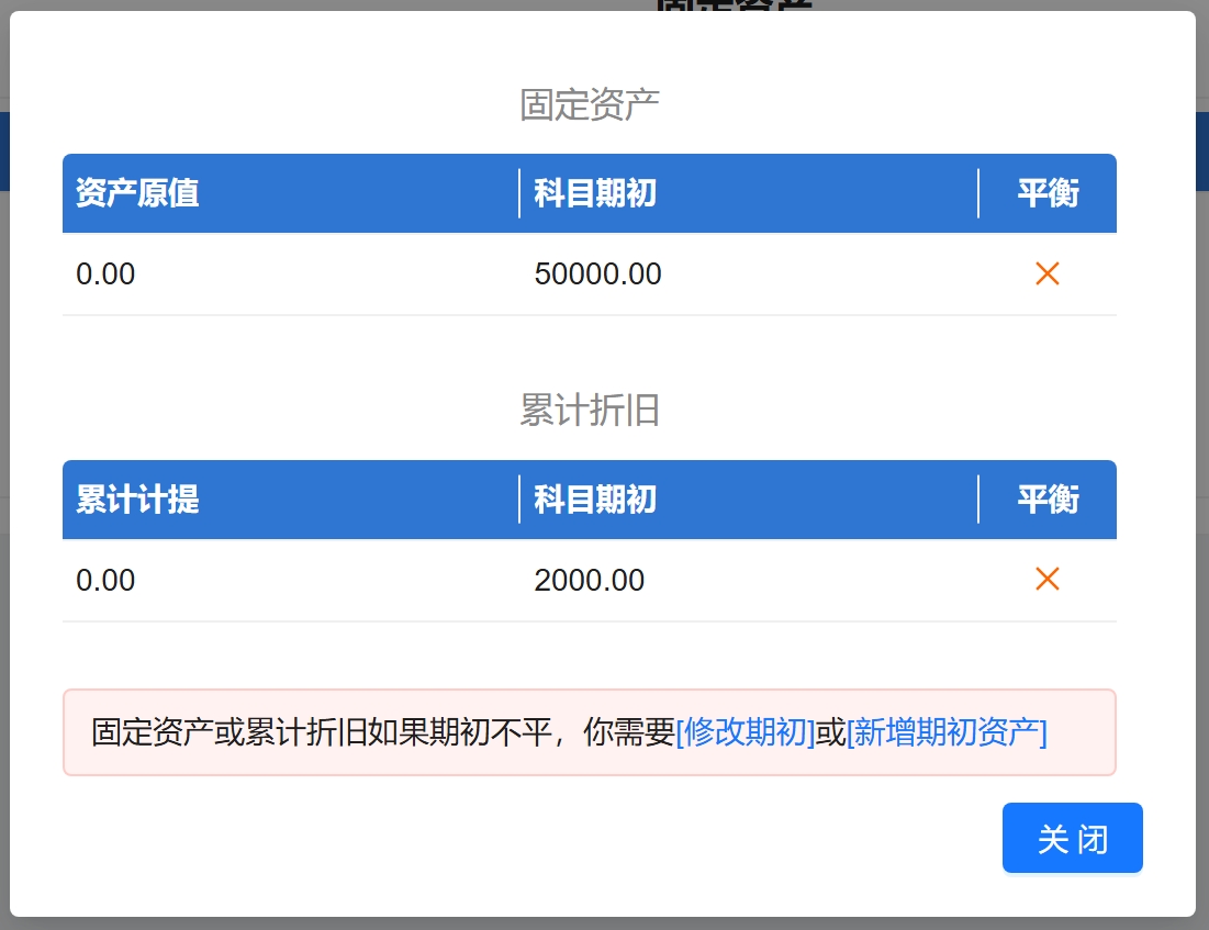 (1) 点击固定资产期数数据不平,点击查看弹出资产期初数据,如下图: