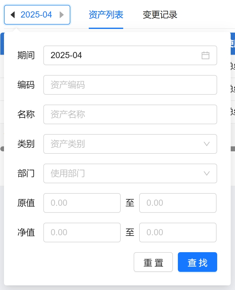 点击左上角的日期控件,弹出检索资产窗口,可根据条件检索资产;也可在不打开检索窗口的情况下,点击向左、向右箭头快速切换会计期间