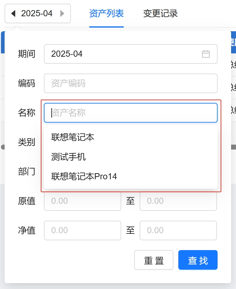 除了原值和净值外其他所有字段都是下拉选择框,无需手动输入内容,直接选择即可筛选,例如检索"资产名称",如下图所示: