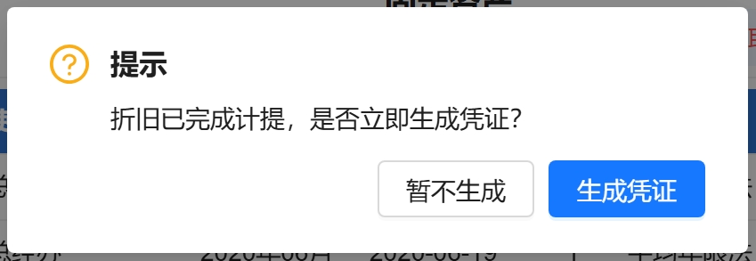 (2) 如果您不想现在生成凭证,或你想每个资产单独生成一张凭证,您可点击暂不生成按钮,后续你可点击资产记录的创建凭证独立创建折旧凭证,如下图: