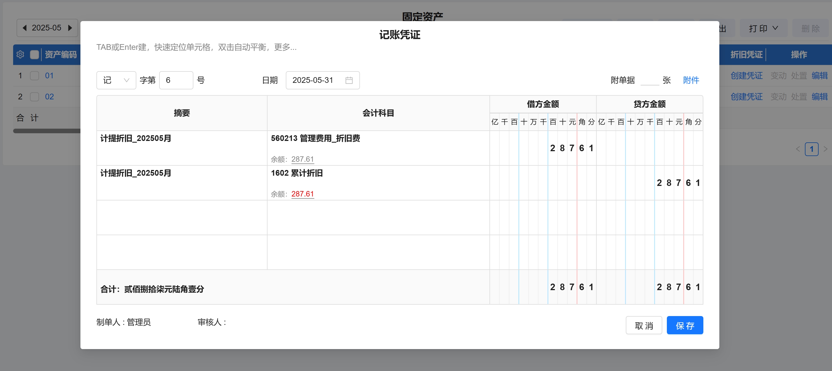 (1) 如果您想立即生成折旧凭证,直接点击生成凭证即可弹出记账凭证,其中摘要、科目、金额都已根据资产数据自动计算,只需点击保存即可创建折旧凭证,如下图: