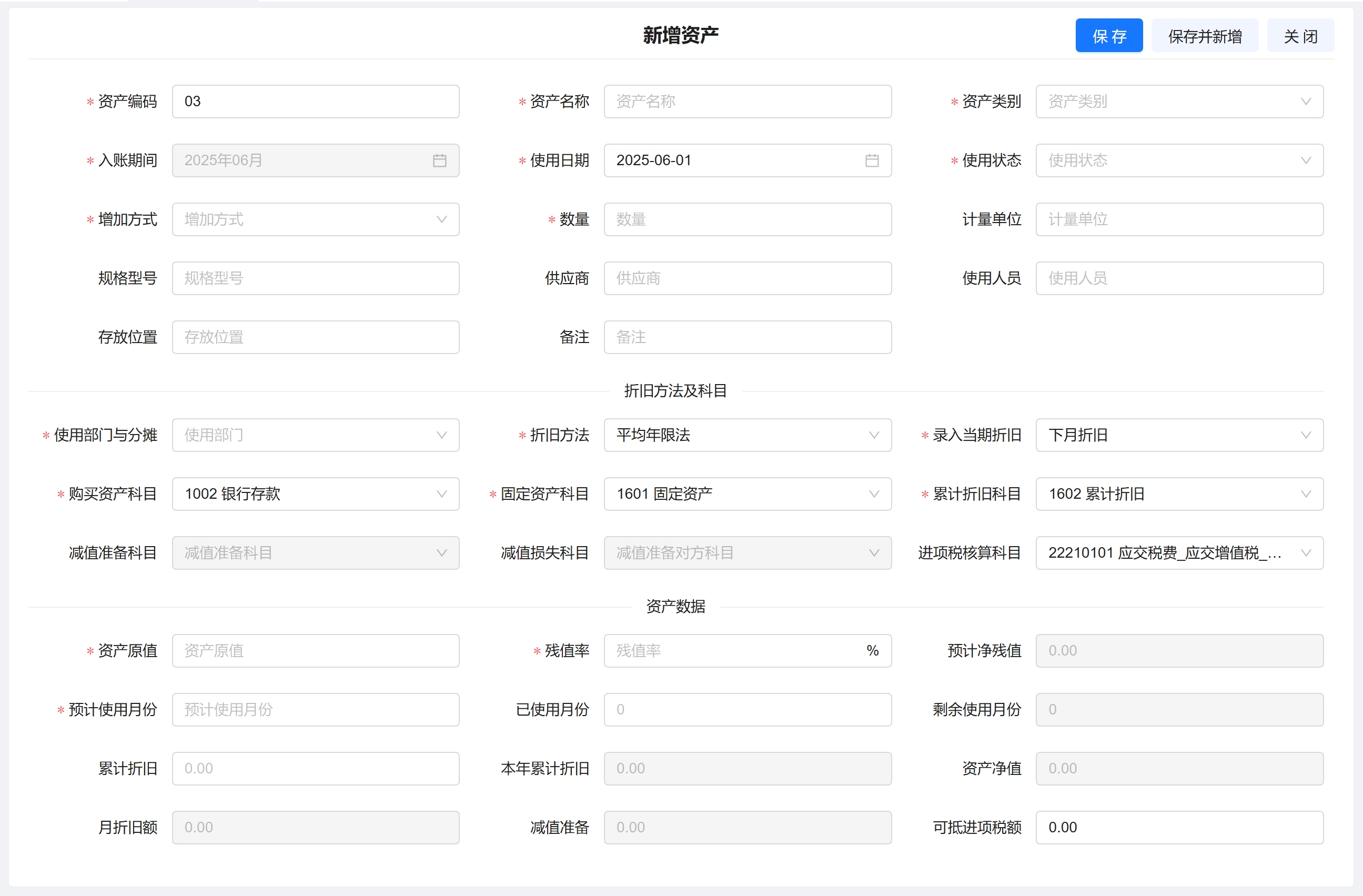 点击新增按钮,打开新增资产Tab页,录入资产信息,点击保存或保存并新增即可新增资产,如下图: