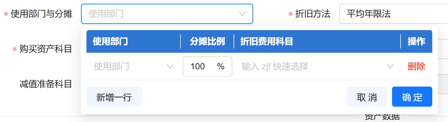 (2) 资产折旧支持按使用部门折旧与摊销,在使用部门与分摊字段中选择使用部门和分摊比例以及折旧费用科目后,折旧时会按此设置折旧与摊销,如下图: