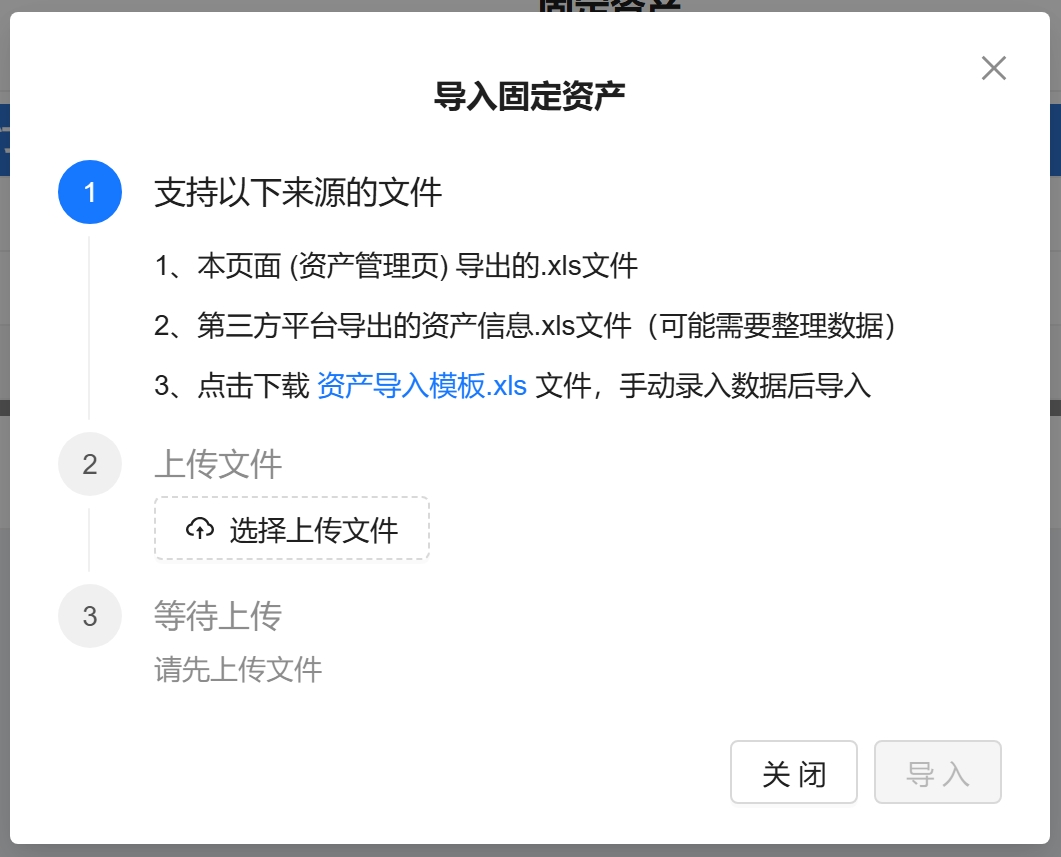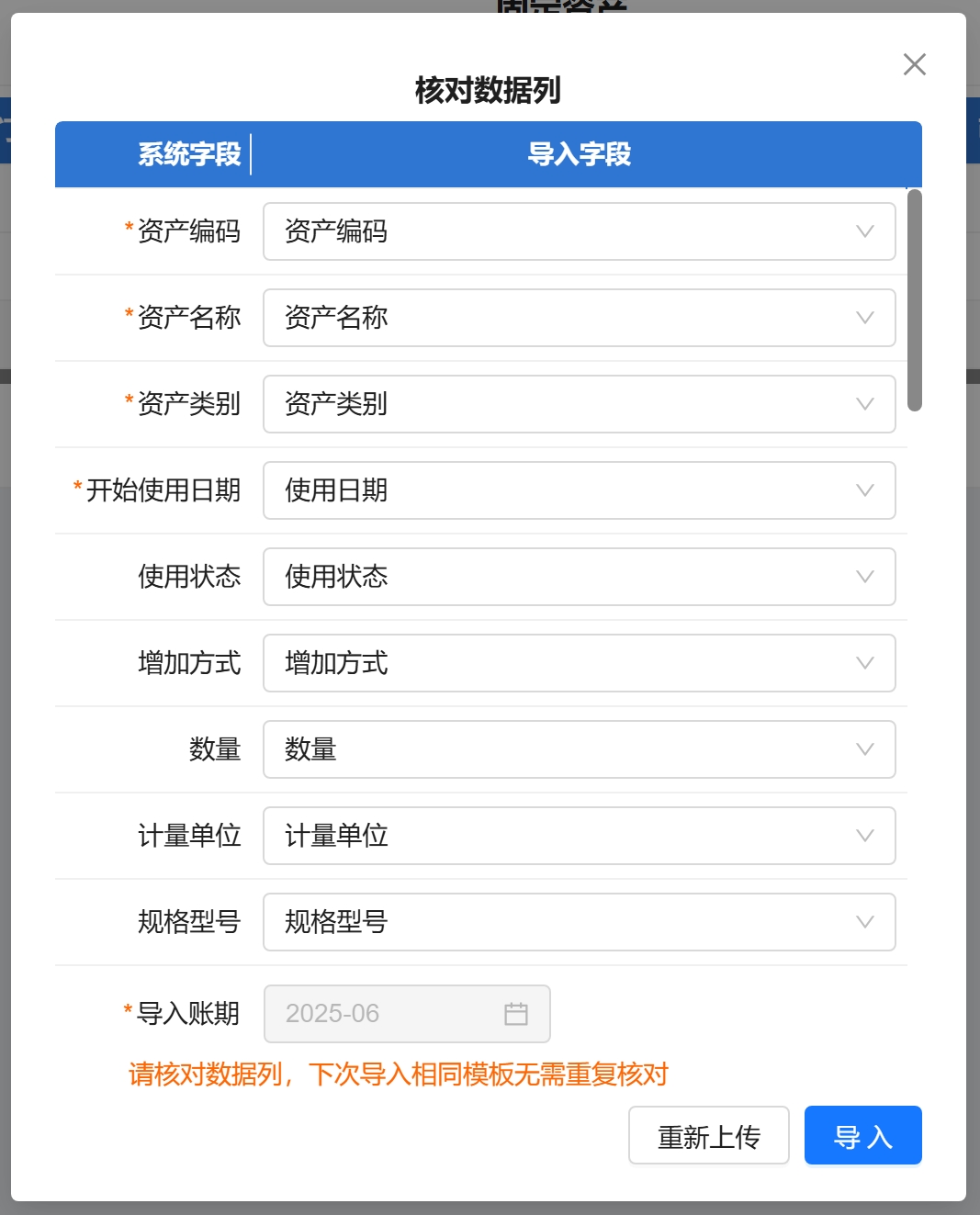 点击导入按钮,弹出导入固定资产对话框,上传导入文件后点击导入按钮,系统会检测导入文件的合法性,并显示核对数据列窗体,核对系统字段和导入文件的字段是否匹配正确,核对无误后点击导入即可导入资产,如下图: