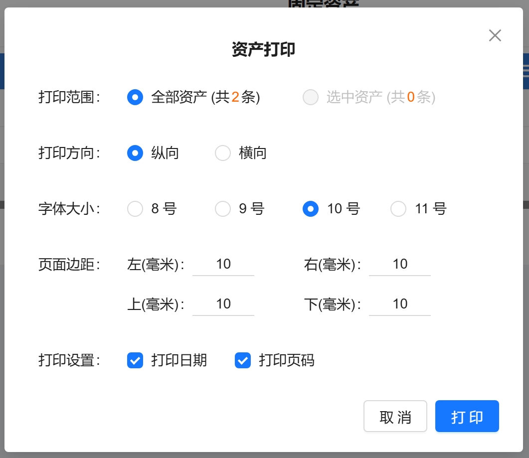 (1) 点击卡片打印按钮,打开资产打印对话框,可设置要打印范围、打印方向、字体大小、页面边距、是否打印日期和页面等选项,如下图所示:
