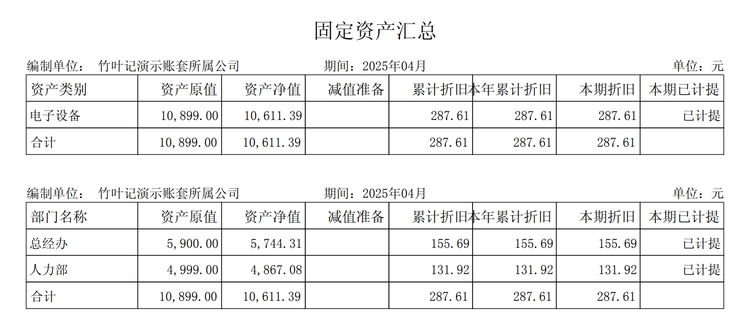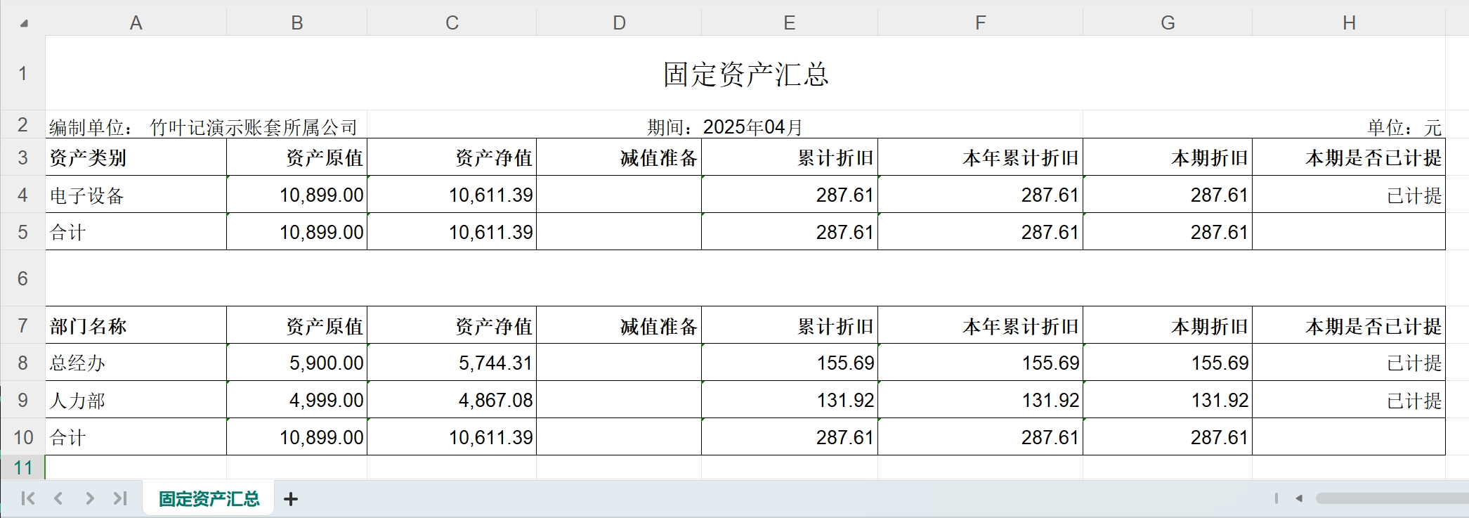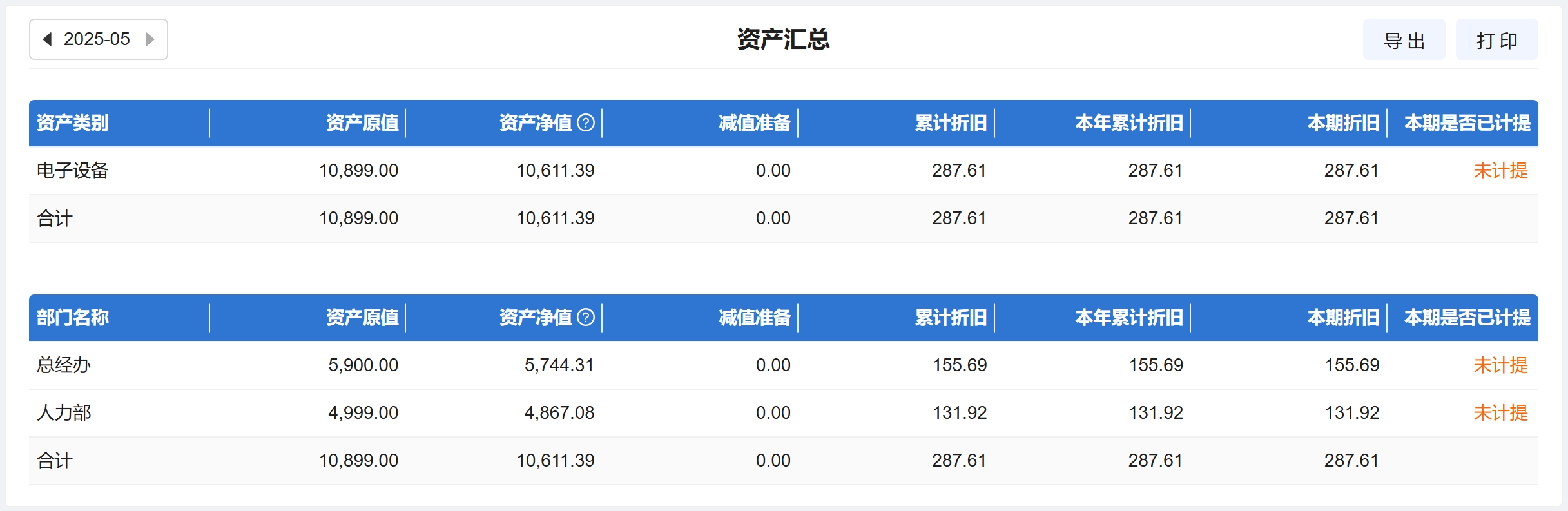 此界面用于汇总资产信息,可按资产类别汇总,也可按使用部门汇总,如下图: