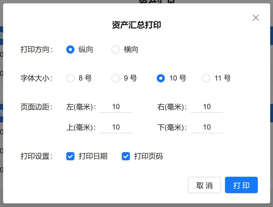 按钮,弹出打印对话框,点击打印即可打印资产汇总数据,如下图所示: