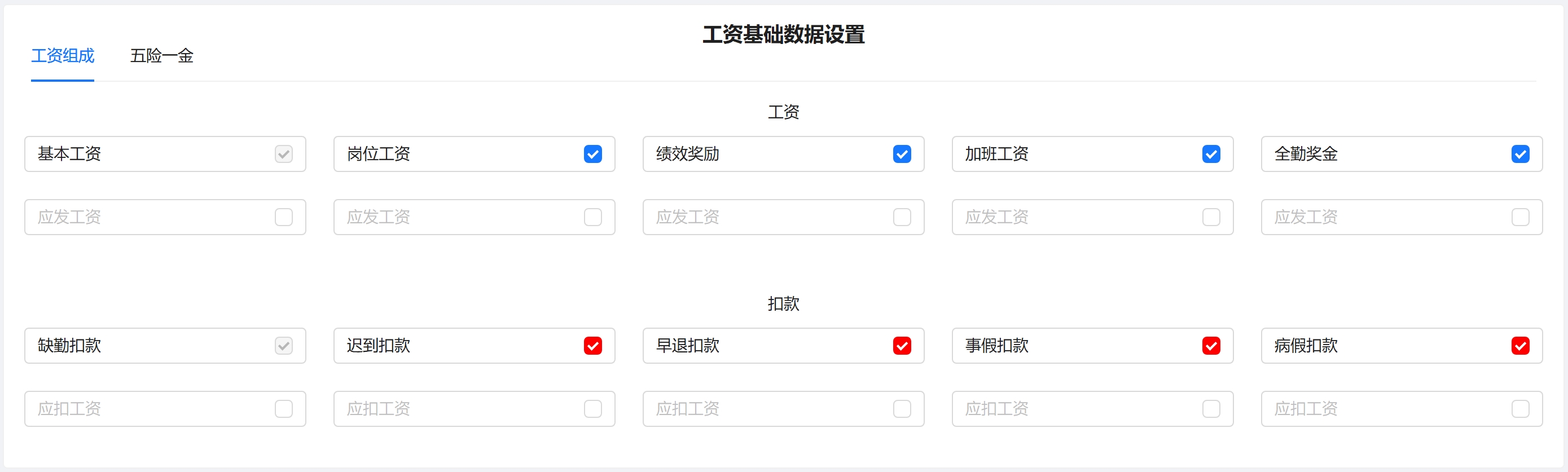 此界面用于设置工资组成和系统级别的五险一金,如下图: