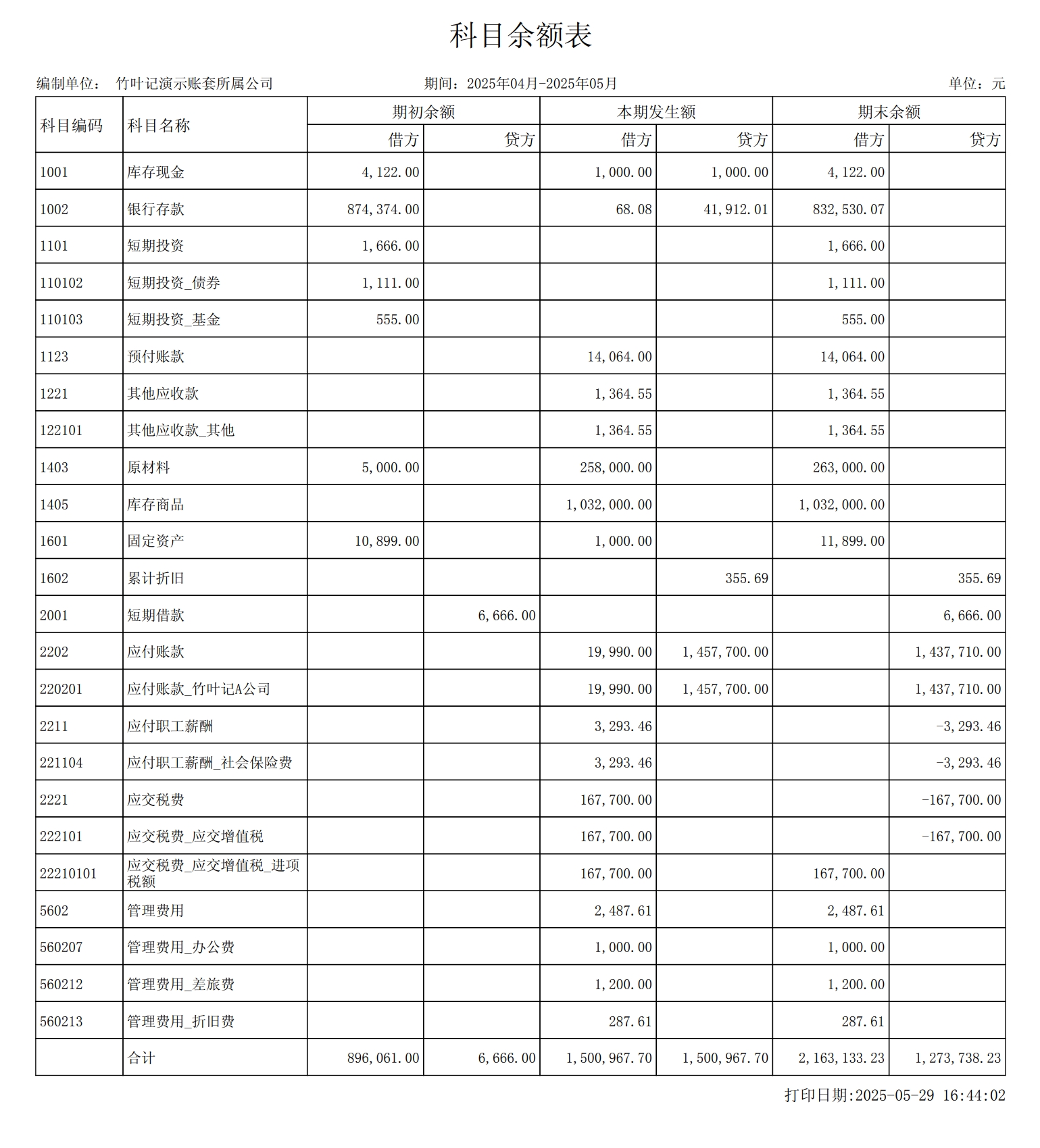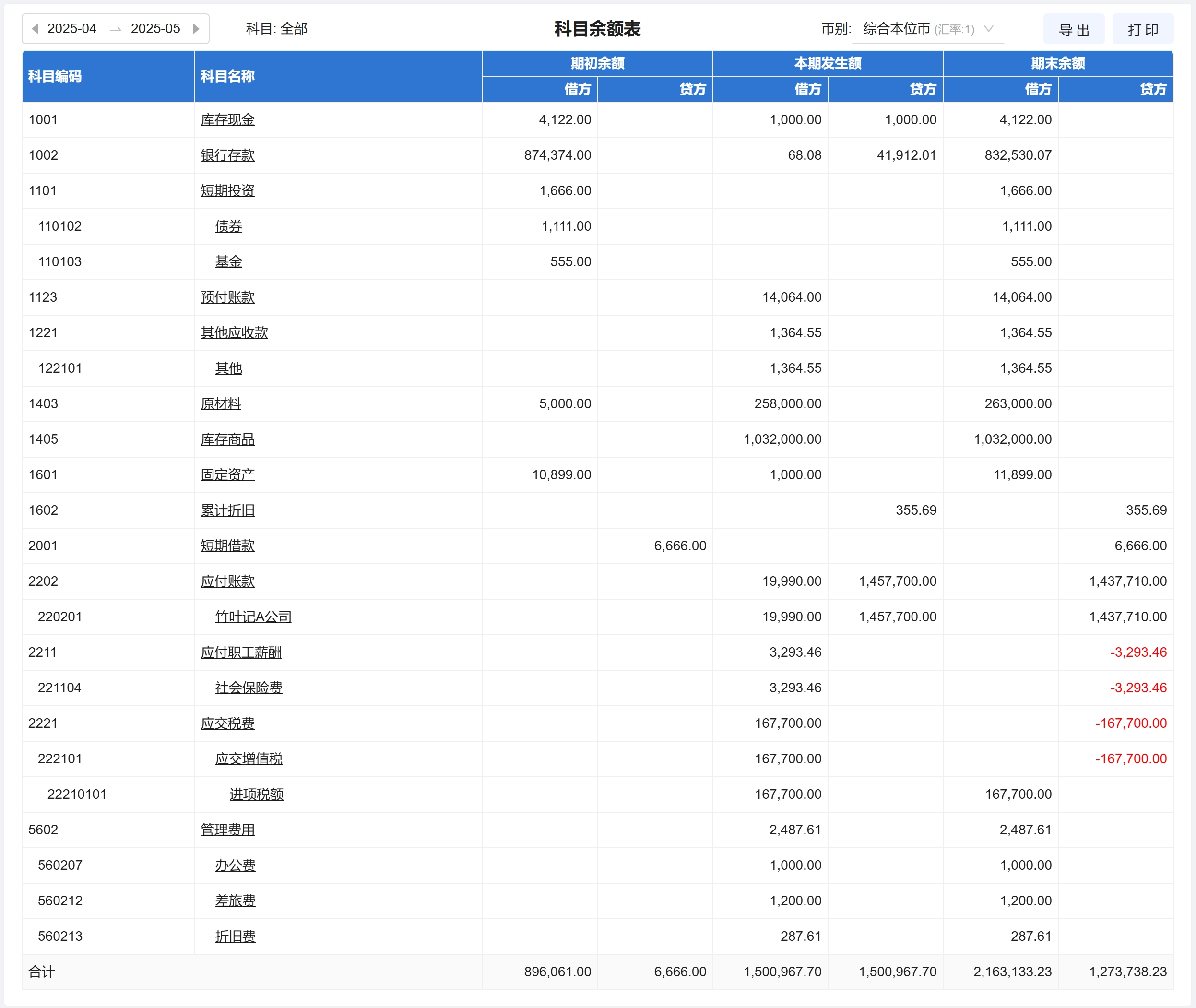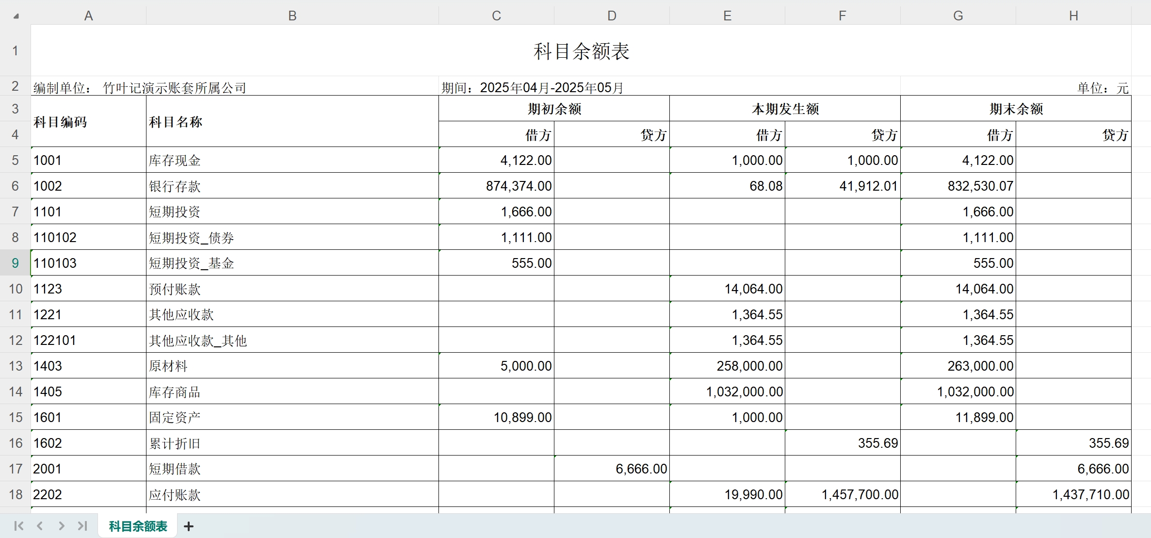 点击导出按钮,可导出科目余额表数据,导出效果如下:
