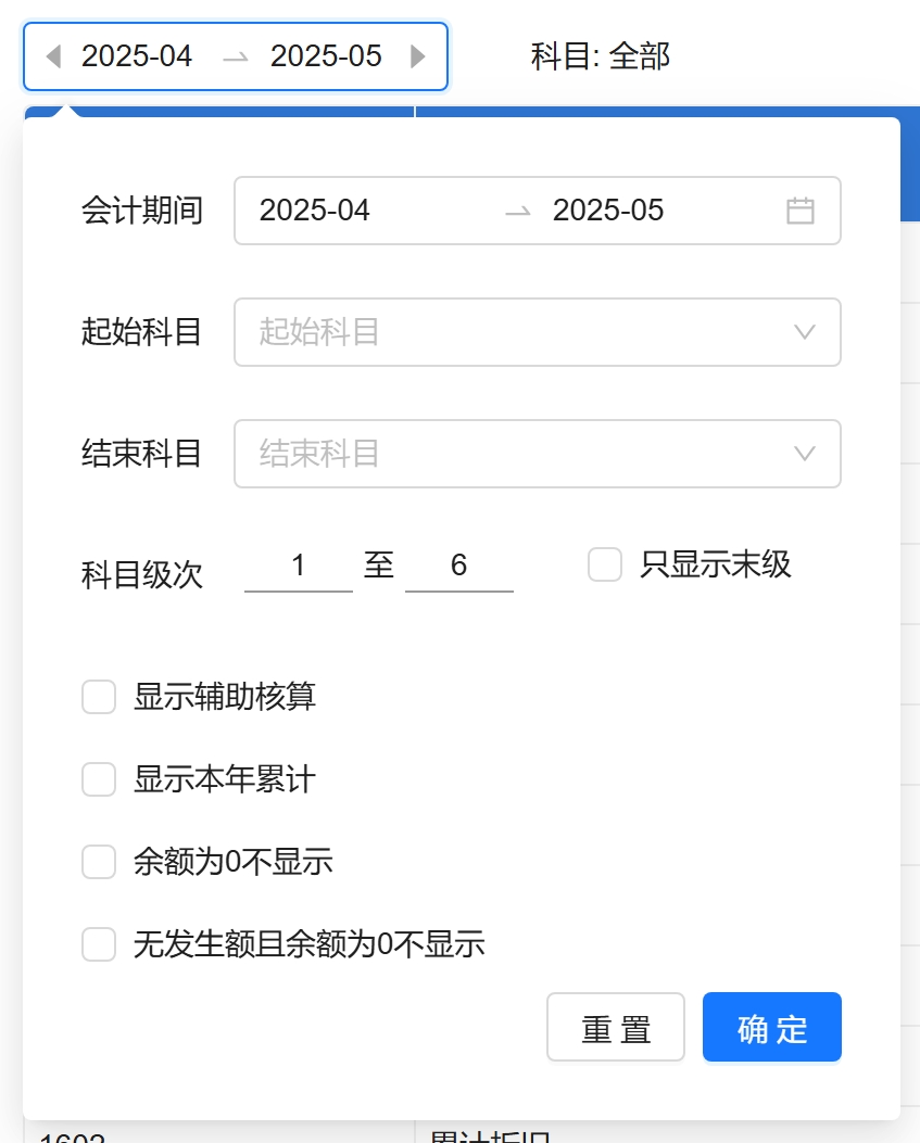 点击左上角的日期控件,弹出检索科目余额表窗口,可根据条件检索科目余额表;也可在不打开检索窗口的情况下,点击向左、向右箭头快速切换会计期间,即可查询不同期间的科目余额表,如下图: