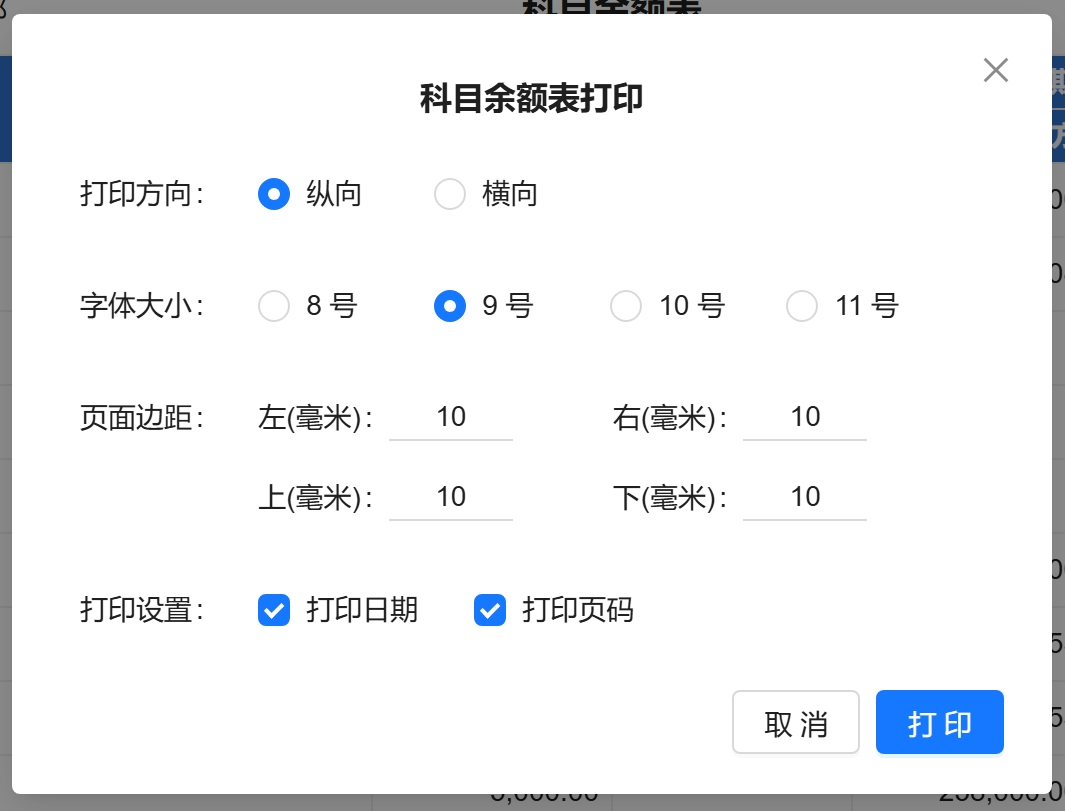 点击打印按钮,弹出打印对话框,点击打印即可打印科目余额表,如下图所示: