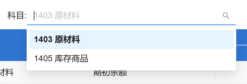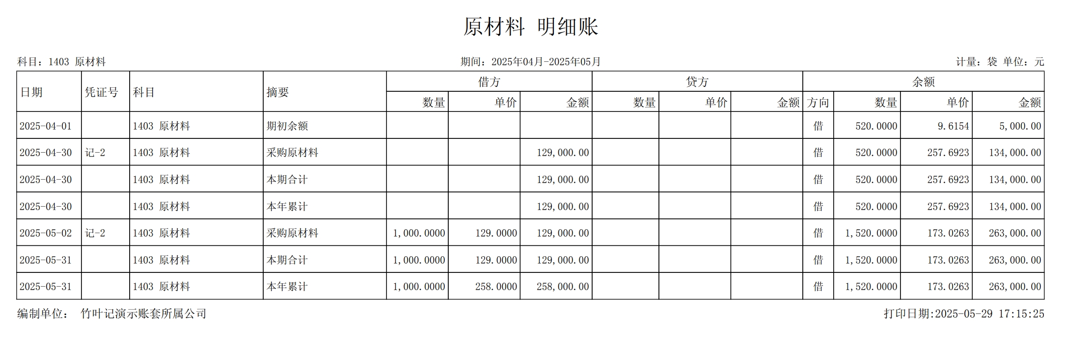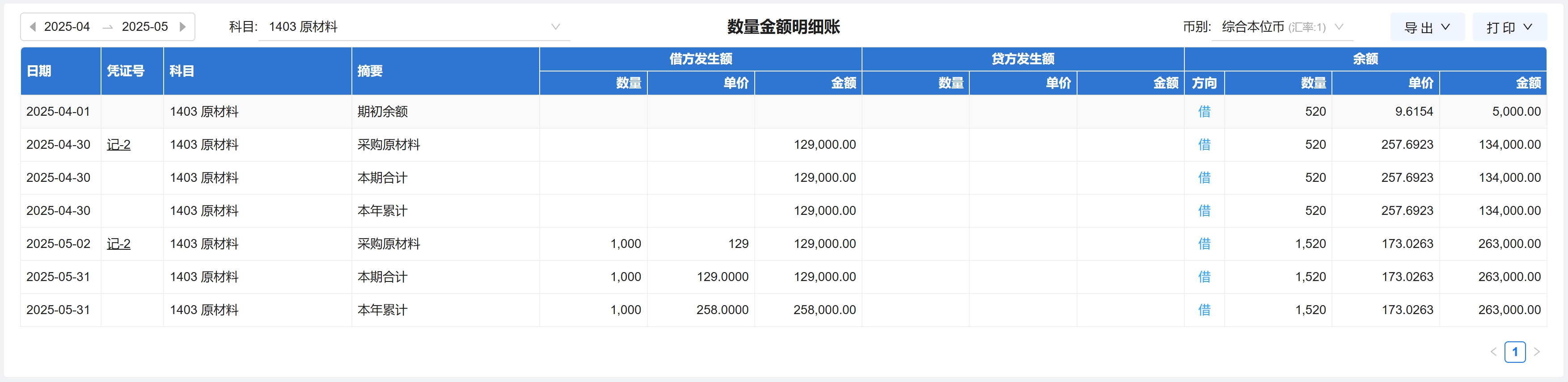 (1) 从科目下拉列表框中选择不同的科目,可以查询不同科目的数量金额明细账,如下图