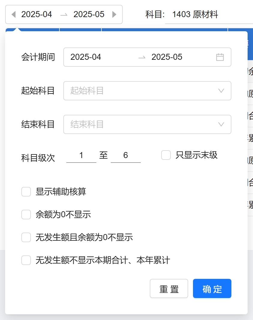 点击左上角的日期控件,弹出检索数量金额明细账窗口,可根据条件检索数量金额明细账;也可在不打开检索窗口的情况下,点击向左、向右箭头快速切换会计期间,即可查询不同期间的数量金额明细账,如下图: